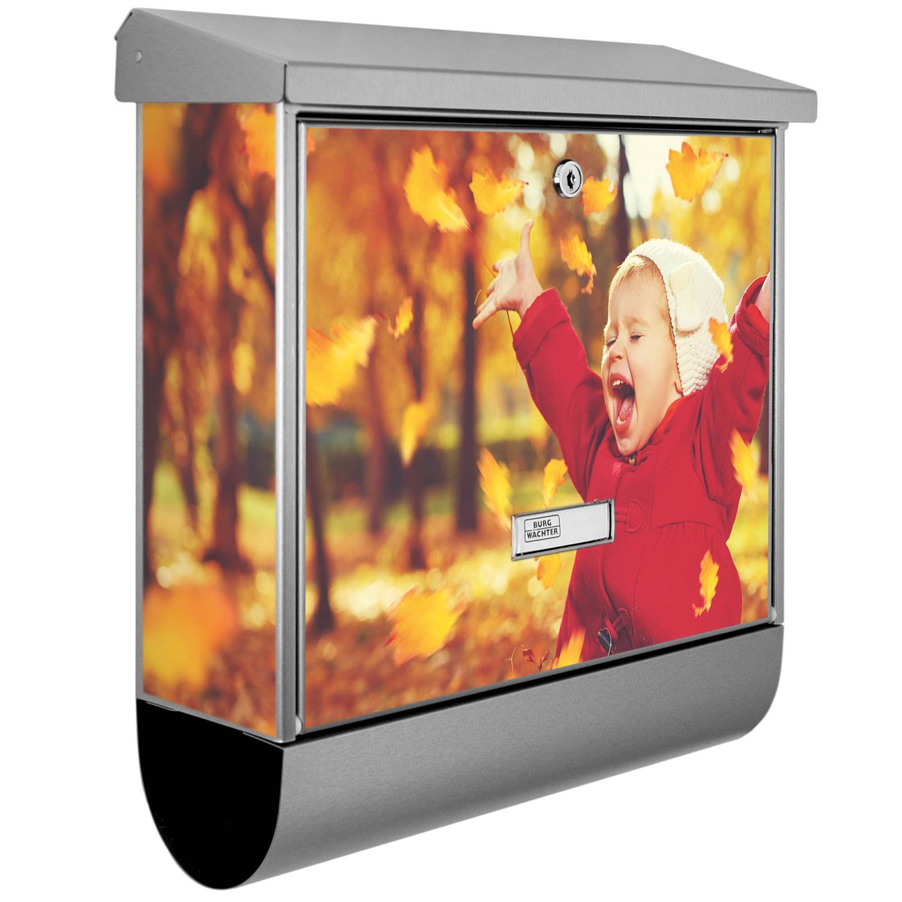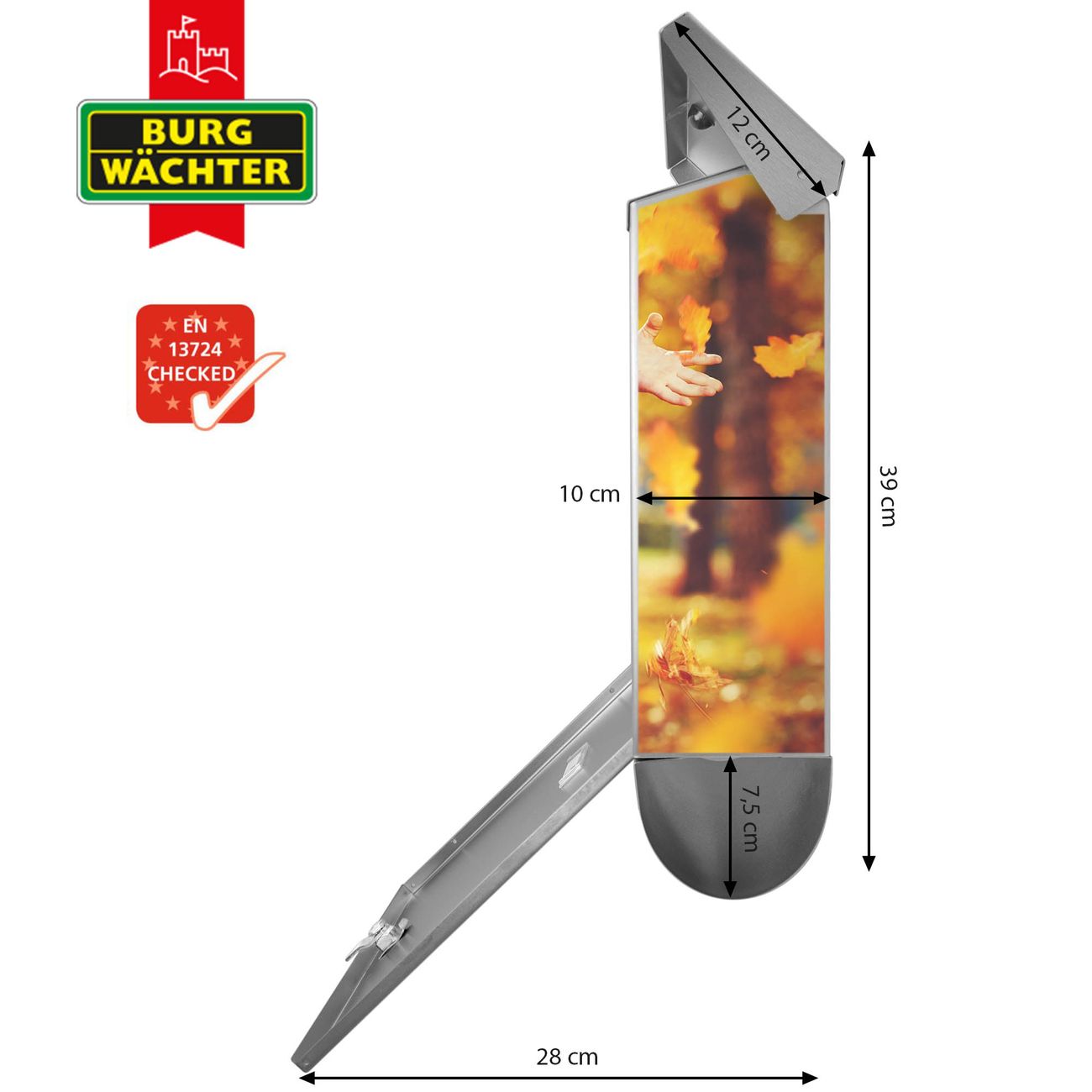 Der BURG-WÄCHTER Edelstahl Briefkasten mit Motiv Herbstfreude und Zeitungsrolle bietet Ihnen mit seinem Fassungsvermögen genügend Platz auch für große A4 Sendungen und Zeitschriften. Das integrierte Regendach schützt Ihre Post vor dem Eindringen von Regen.