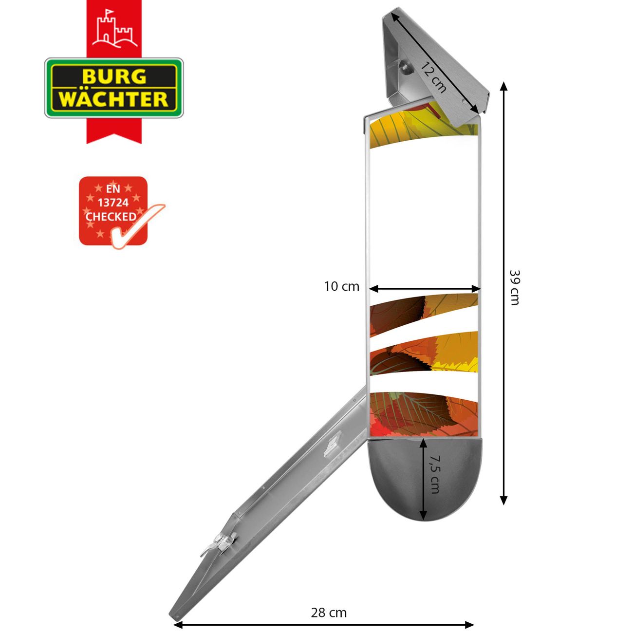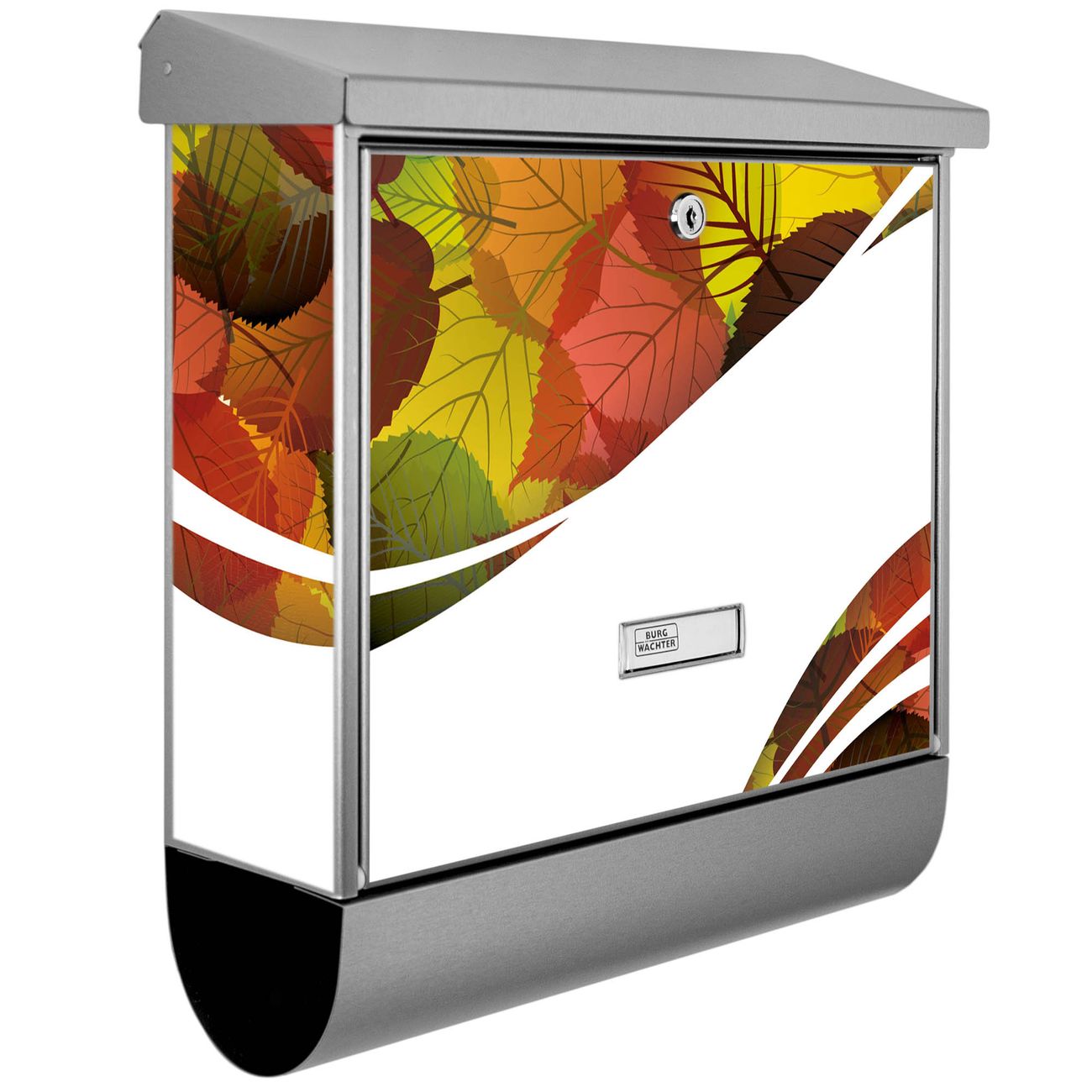 Der BURG-WÄCHTER Edelstahl Briefkasten mit Motiv Herbstlaub und Zeitungsrolle bietet Ihnen mit seinem Fassungsvermögen genügend Platz auch für große A4 Sendungen und Zeitschriften. Das integrierte Regendach schützt Ihre Post vor dem Eindringen von Regen.