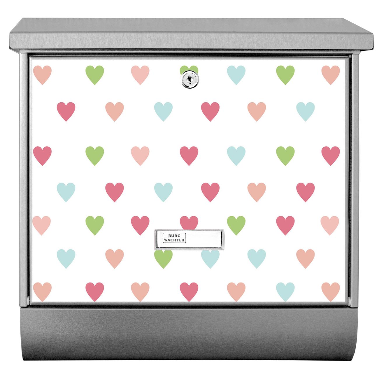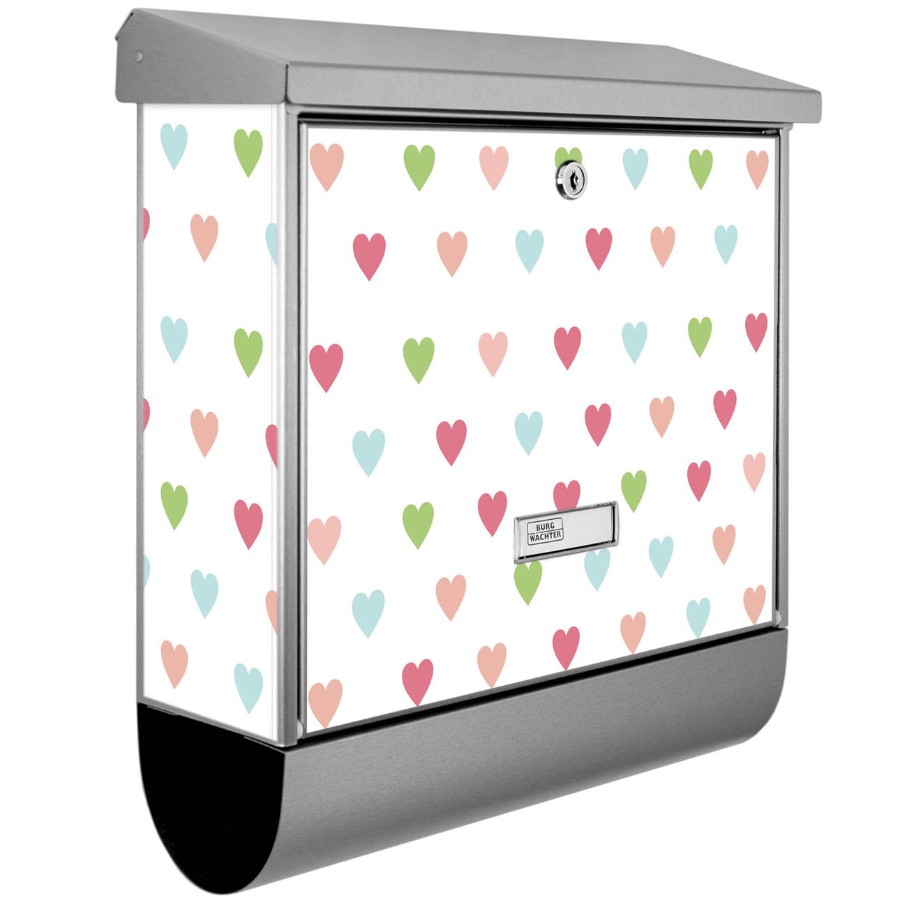 Der BURG-WÄCHTER Edelstahl Briefkasten mit Motiv Herzen Auf Weiß und Zeitungsrolle bietet Ihnen mit seinem Fassungsvermögen genügend Platz auch für große A4 Sendungen und Zeitschriften. Das integrierte Regendach schützt Ihre Post vor dem Eindringen von Regen.