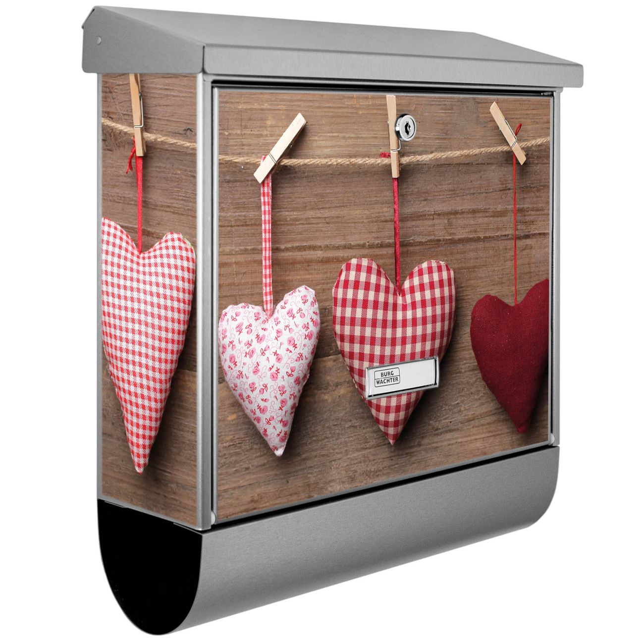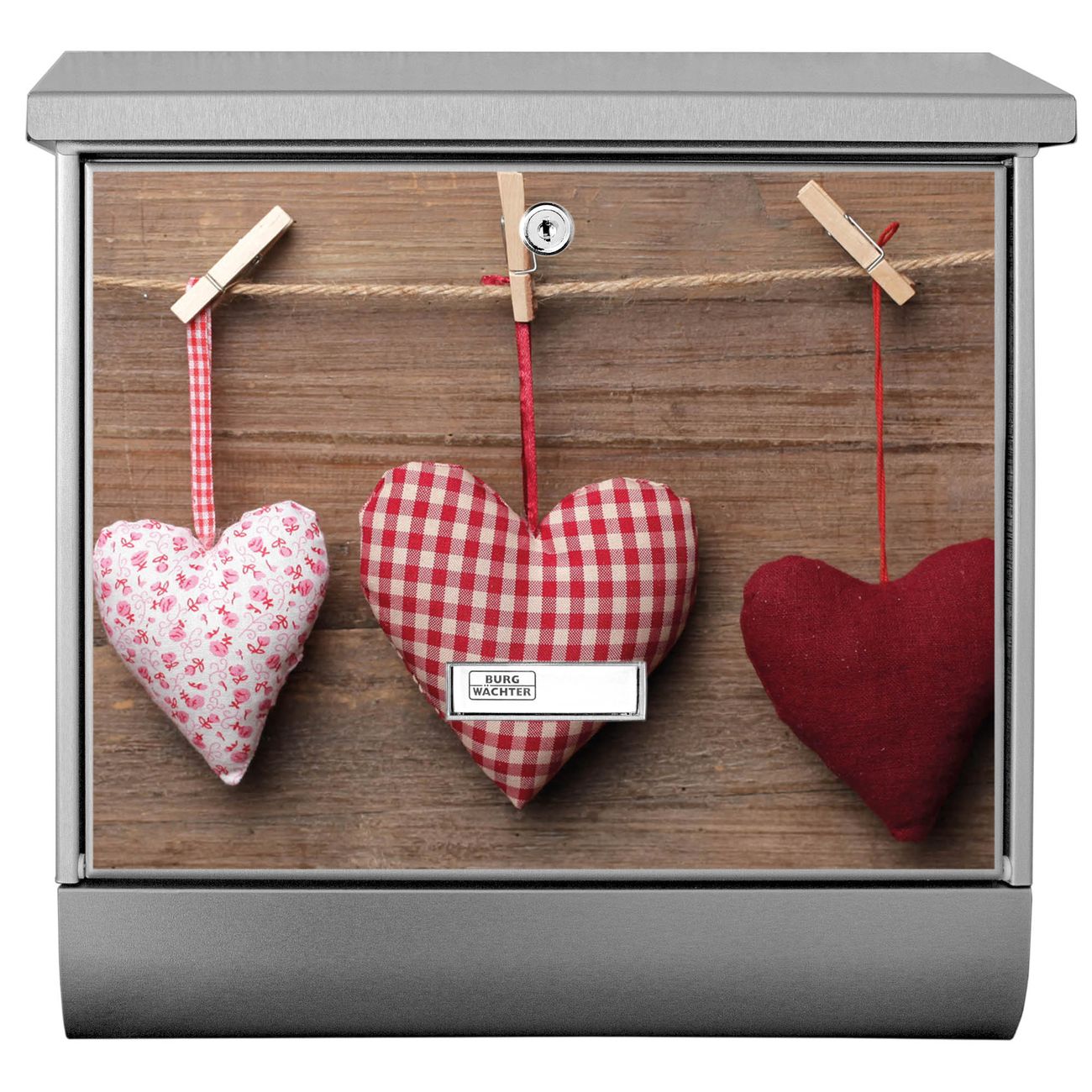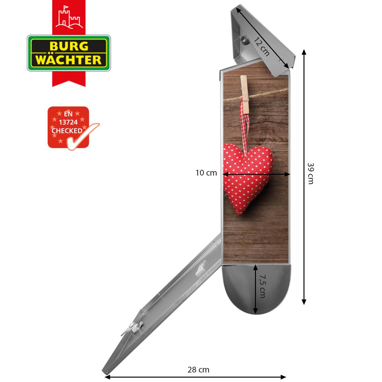 Der BURG-WÄCHTER Edelstahl Briefkasten mit Motiv Herzen und Zeitungsrolle bietet Ihnen mit seinem Fassungsvermögen genügend Platz auch für große A4 Sendungen und Zeitschriften. Das integrierte Regendach schützt Ihre Post vor dem Eindringen von Regen.