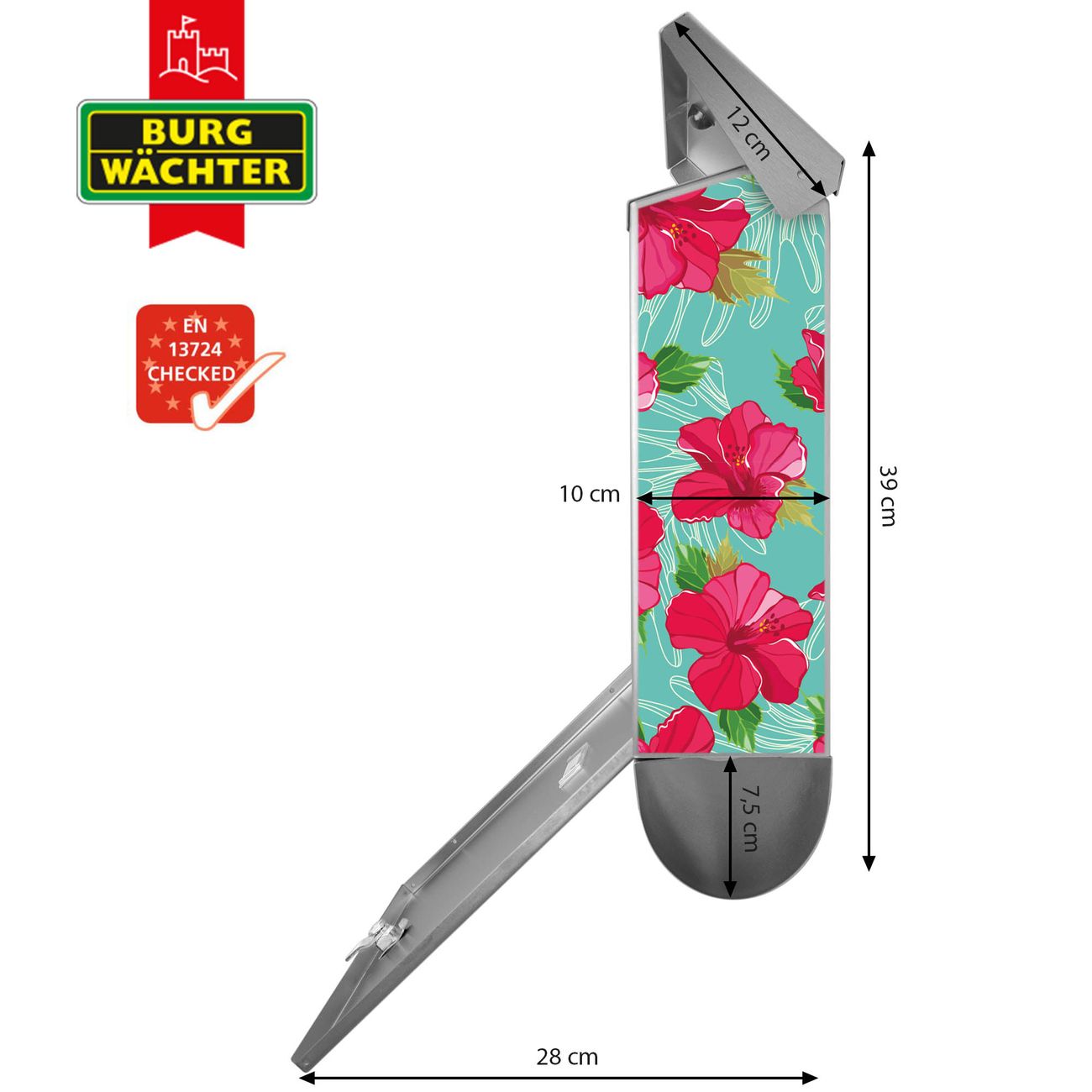 Der BURG-WÄCHTER Edelstahl Briefkasten mit Motiv Hibiskus und Zeitungsrolle bietet Ihnen mit seinem Fassungsvermögen genügend Platz auch für große A4 Sendungen und Zeitschriften. Das integrierte Regendach schützt Ihre Post vor dem Eindringen von Regen.