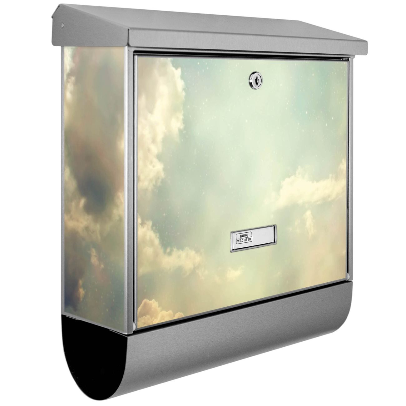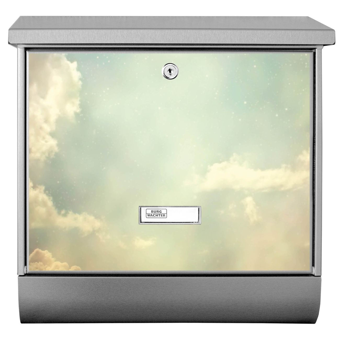 Der BURG-WÄCHTER Edelstahl Briefkasten mit Motiv Himmel Vintage und Zeitungsrolle bietet Ihnen mit seinem Fassungsvermögen genügend Platz auch für große A4 Sendungen und Zeitschriften. Das integrierte Regendach schützt Ihre Post vor dem Eindringen von Regen.