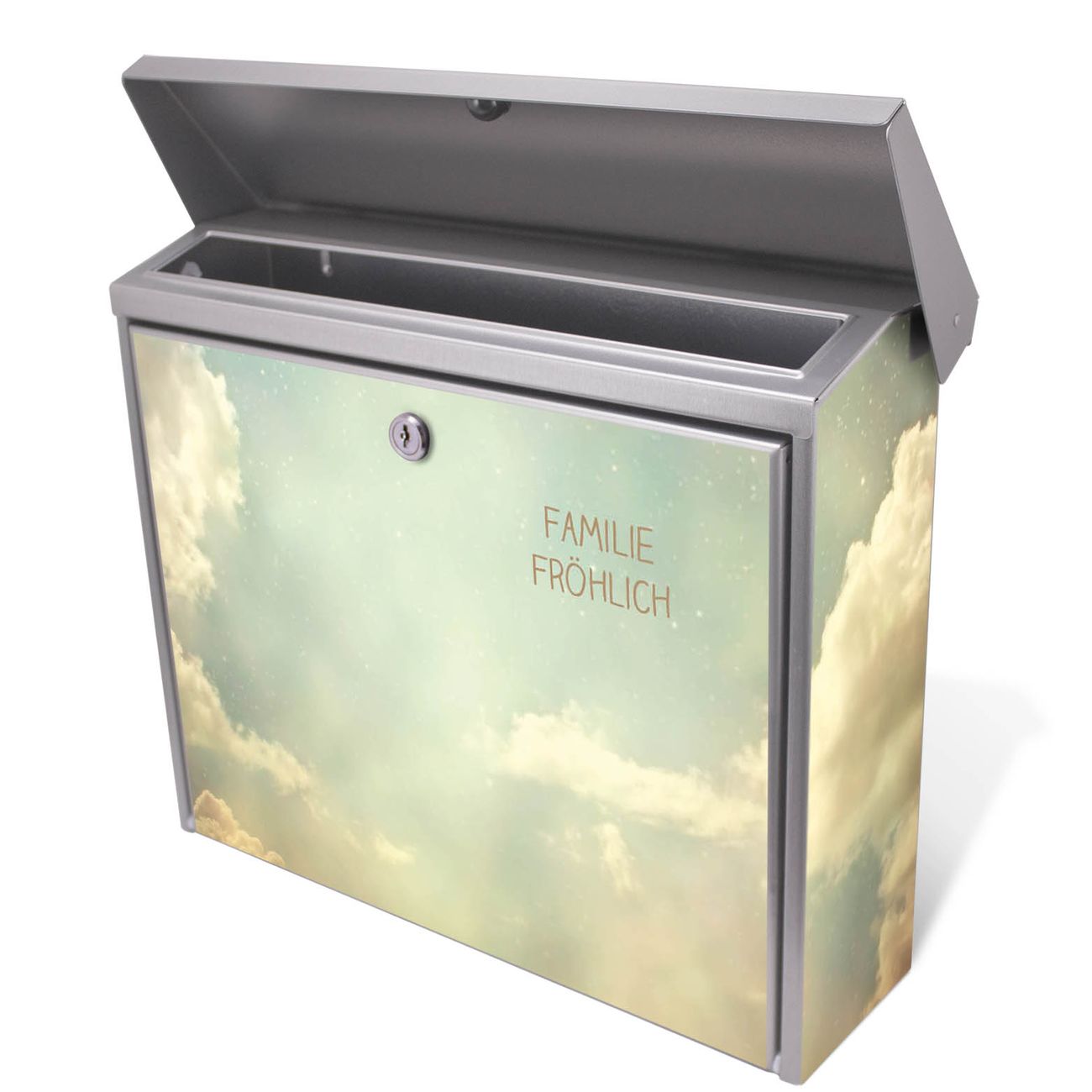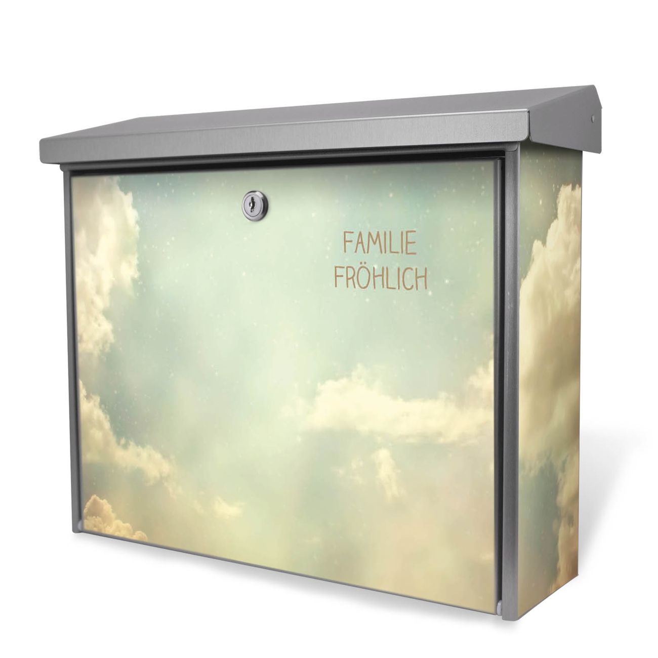 Der Postkasten mit Himmel Vintage Motiv hat ein sehr ansprechendes und zeitloses Design. Unsere Motivpalette hält jede Menge Varianten bereit, ob klassisch, modern, verspielt oder witzig - für jeden haben wir das passende Motiv parat. Der Briefkasten ist das Aushängeschild Ihres Hauses.