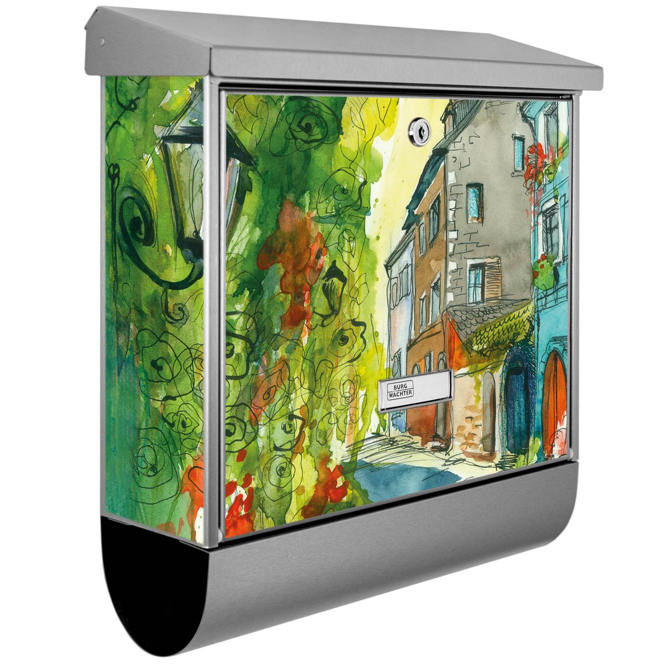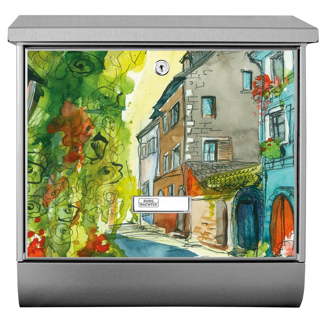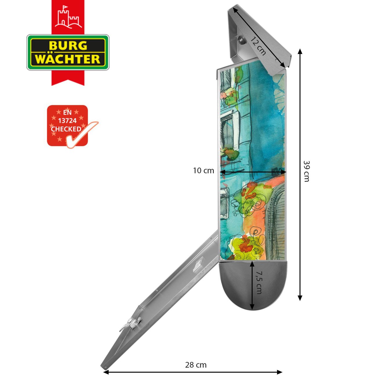 Der BURG-WÄCHTER Edelstahl Briefkasten mit Motiv Historischer Stadtkern und Zeitungsrolle bietet Ihnen mit seinem Fassungsvermögen genügend Platz auch für große A4 Sendungen und Zeitschriften. Das integrierte Regendach schützt Ihre Post vor dem Eindringen von Regen.