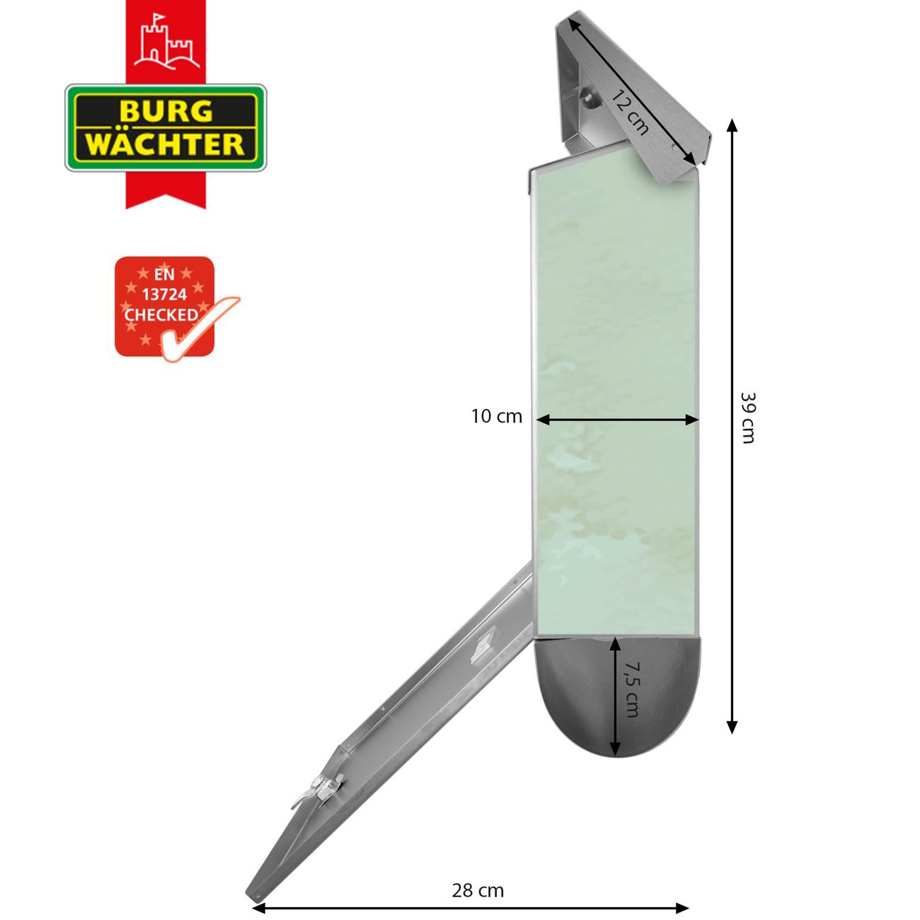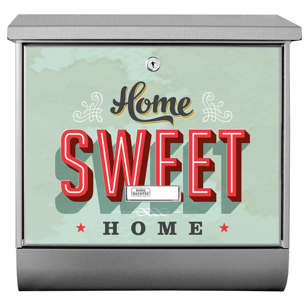 Der BURG-WÄCHTER Edelstahl Briefkasten mit Motiv Home Sweet Home und Zeitungsrolle bietet Ihnen mit seinem Fassungsvermögen genügend Platz auch für große A4 Sendungen und Zeitschriften. Das integrierte Regendach schützt Ihre Post vor dem Eindringen von Regen.