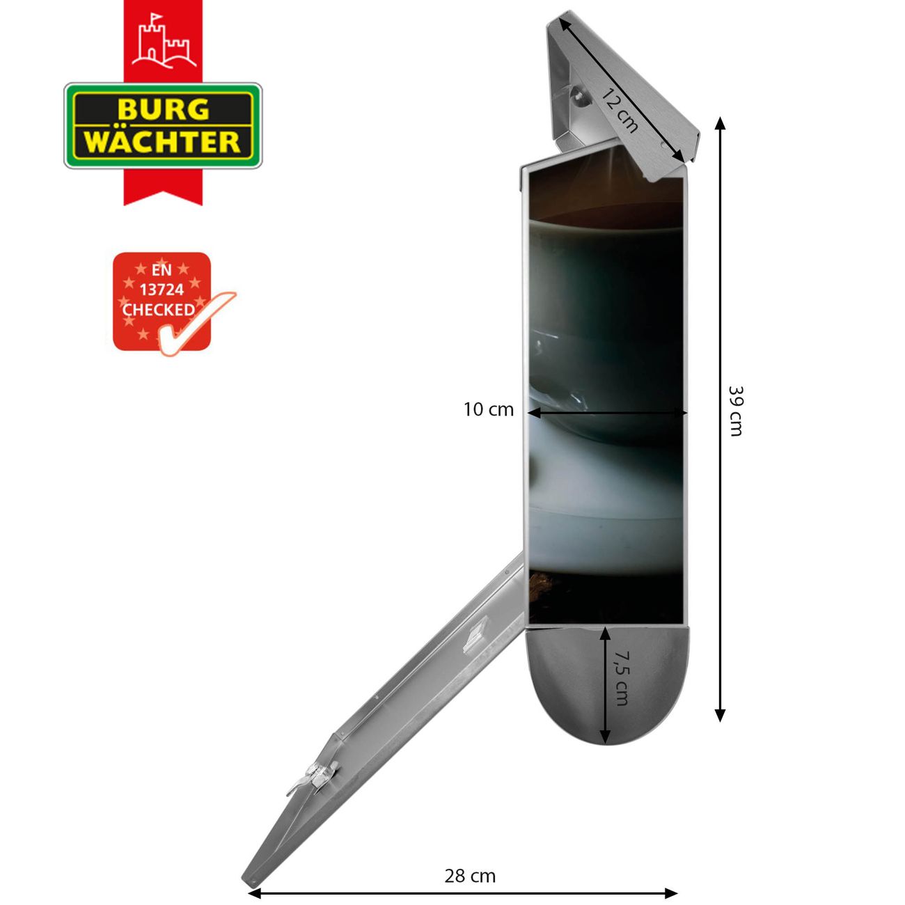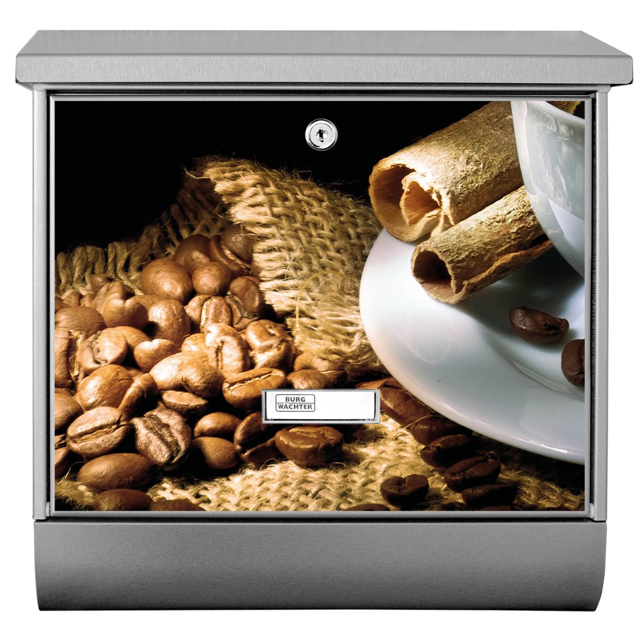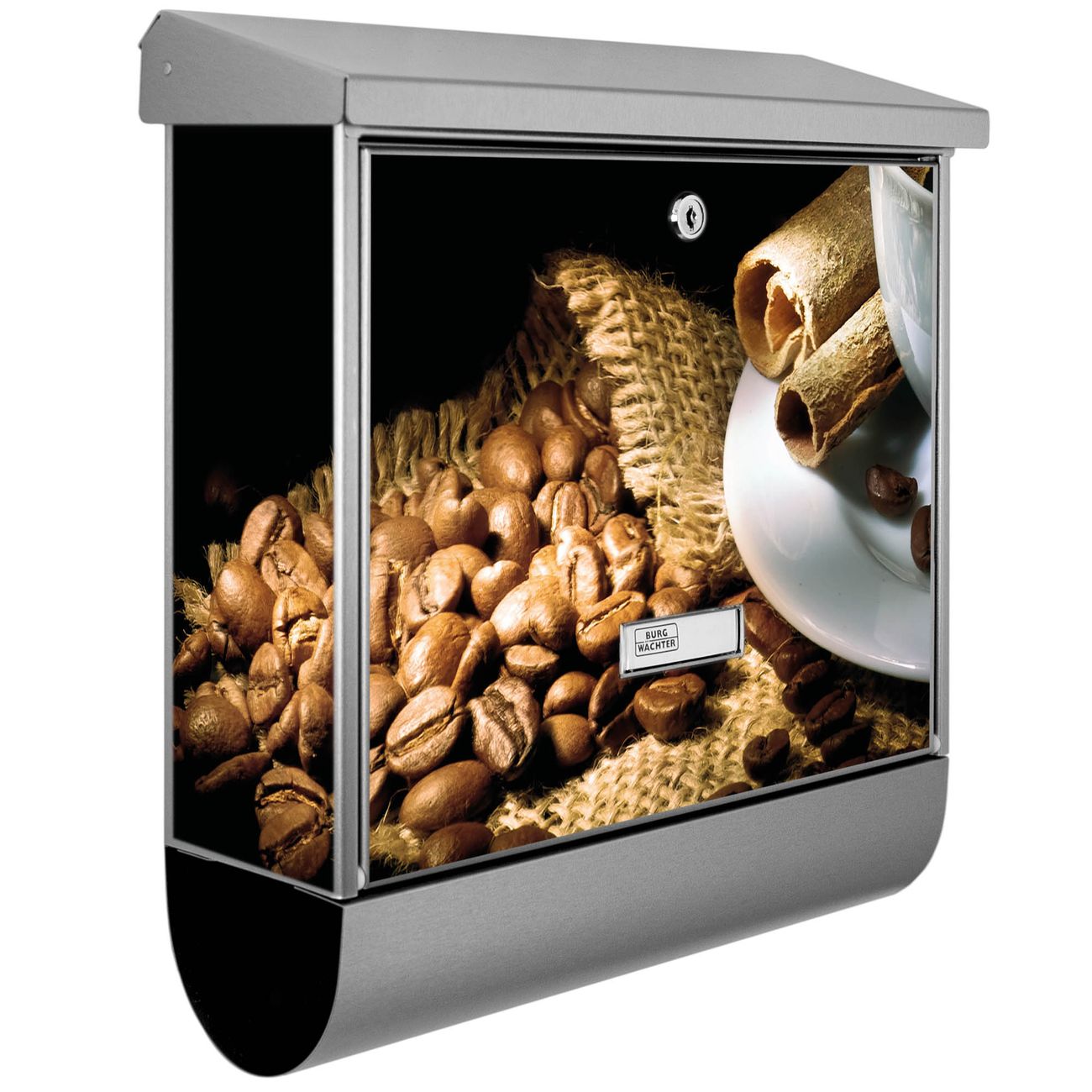 Der BURG-WÄCHTER Edelstahl Briefkasten mit Motiv Hot Coffee und Zeitungsrolle bietet Ihnen mit seinem Fassungsvermögen genügend Platz auch für große A4 Sendungen und Zeitschriften. Das integrierte Regendach schützt Ihre Post vor dem Eindringen von Regen.