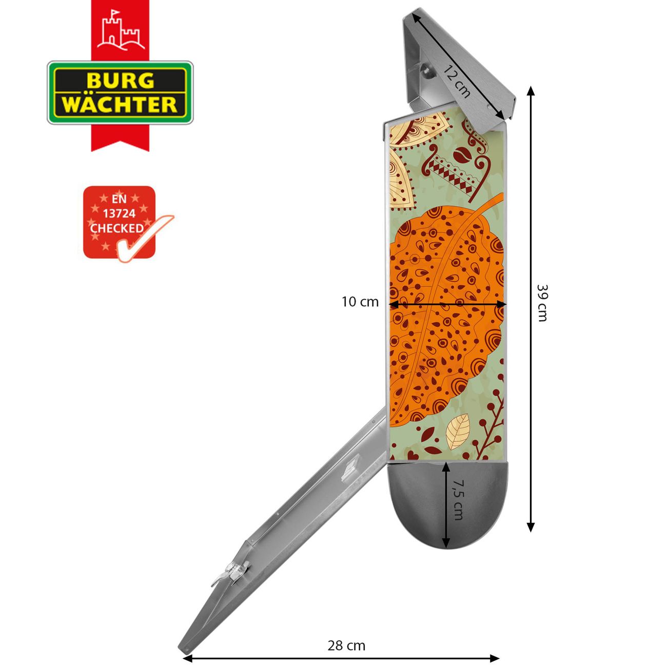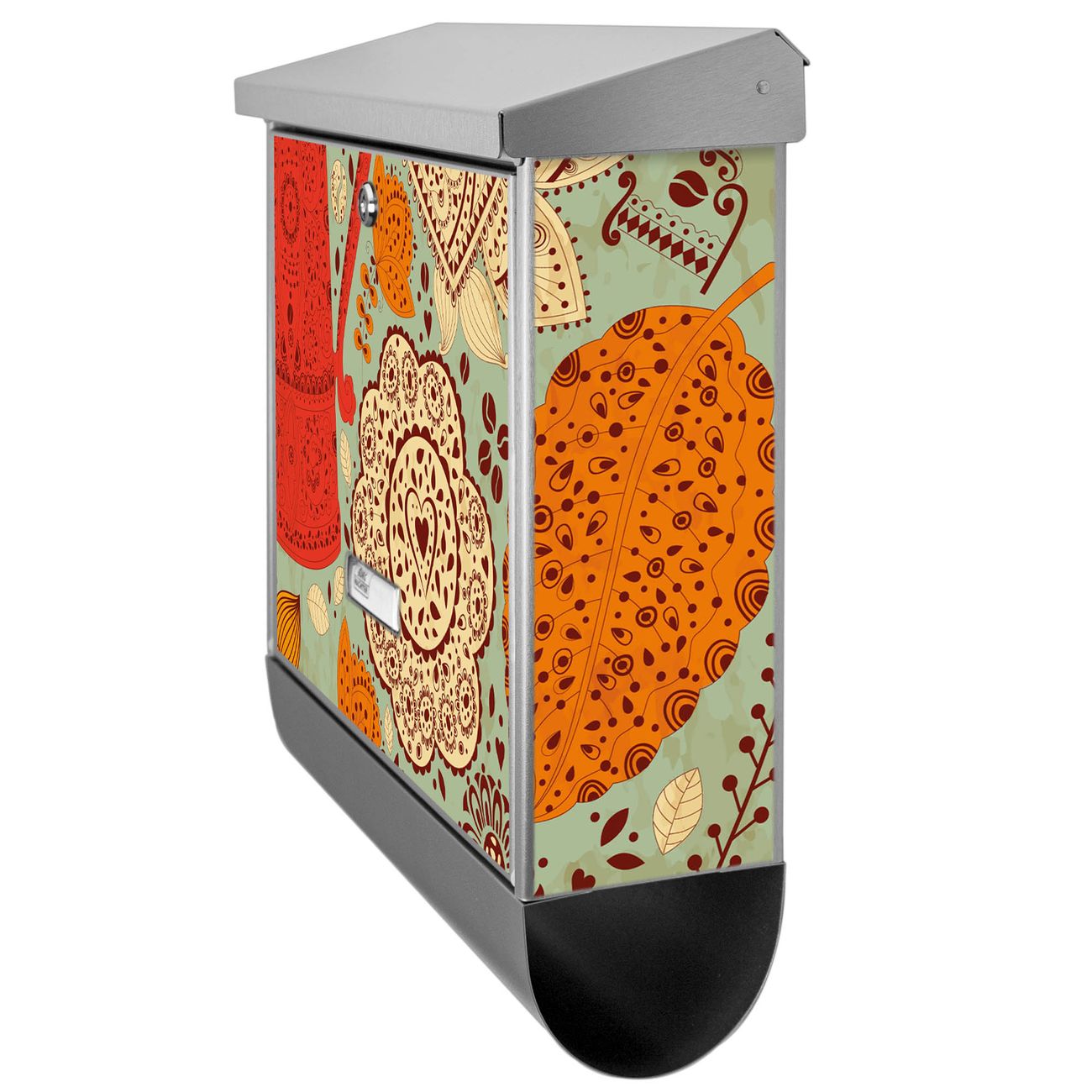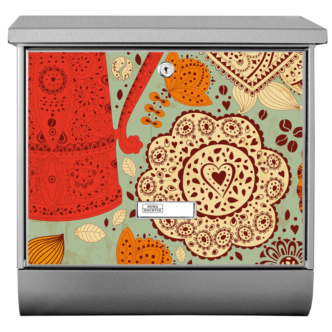 Der BURG-WÄCHTER Edelstahl Briefkasten mit Motiv Indischer Kaffee und Zeitungsrolle bietet Ihnen mit seinem Fassungsvermögen genügend Platz auch für große A4 Sendungen und Zeitschriften. Das integrierte Regendach schützt Ihre Post vor dem Eindringen von Regen.