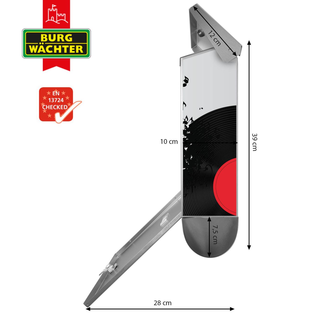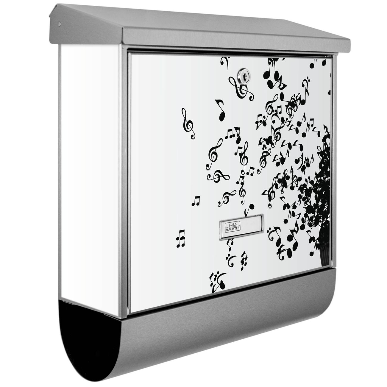 Der BURG-WÄCHTER Edelstahl Briefkasten mit Motiv Juke Box und Zeitungsrolle bietet Ihnen mit seinem Fassungsvermögen genügend Platz auch für große A4 Sendungen und Zeitschriften. Das integrierte Regendach schützt Ihre Post vor dem Eindringen von Regen.