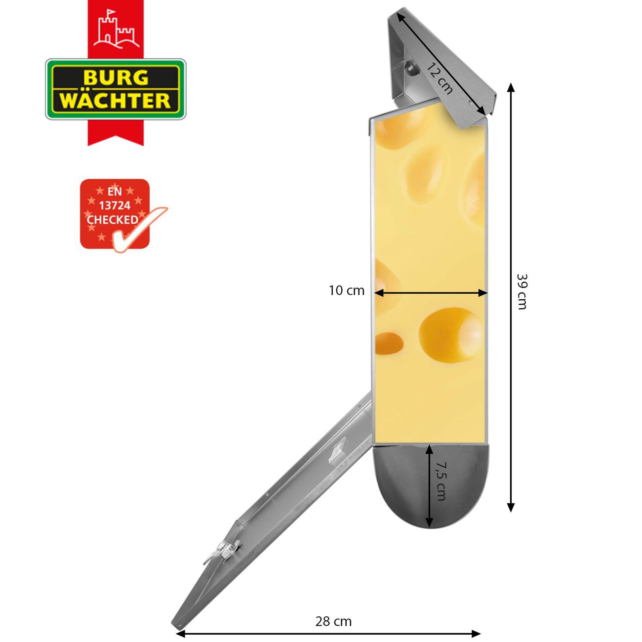 Der BURG-WÄCHTER Edelstahl Briefkasten mit Motiv Käse und Zeitungsrolle bietet Ihnen mit seinem Fassungsvermögen genügend Platz auch für große A4 Sendungen und Zeitschriften. Das integrierte Regendach schützt Ihre Post vor dem Eindringen von Regen.