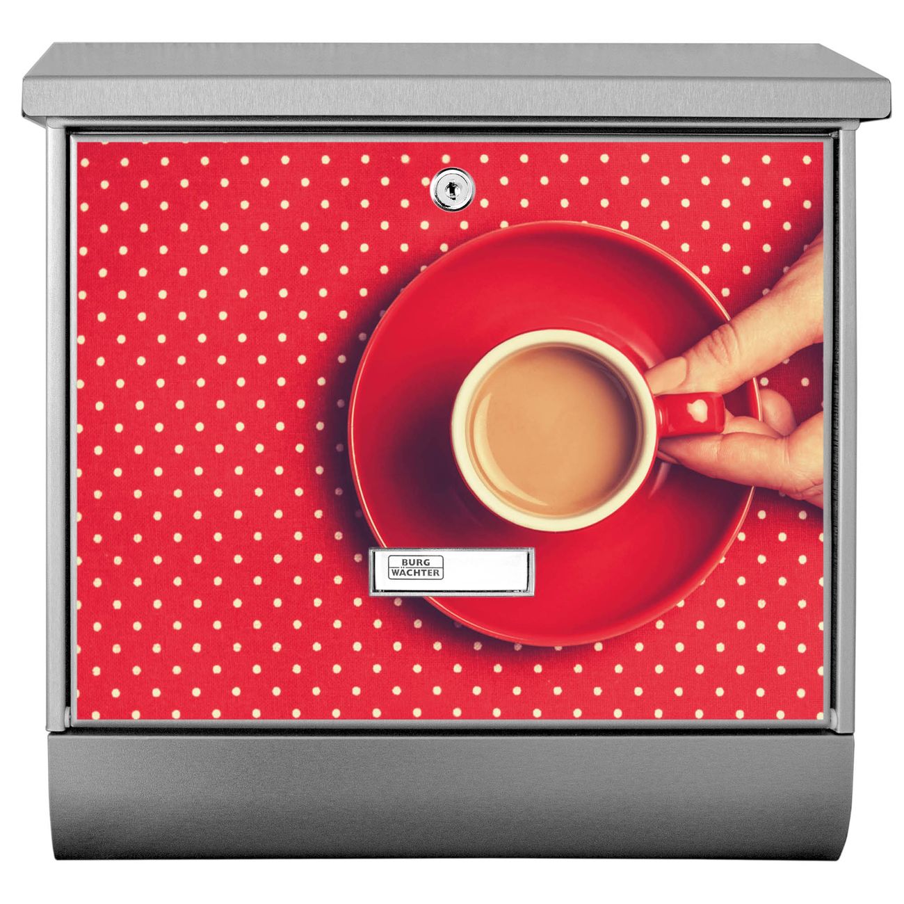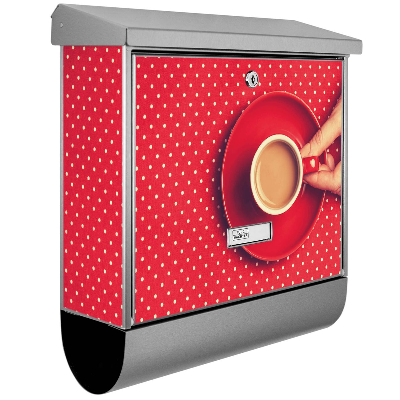 Der BURG-WÄCHTER Edelstahl Briefkasten mit Motiv Kaffee Rot Weiss und Zeitungsrolle bietet Ihnen mit seinem Fassungsvermögen genügend Platz auch für große A4 Sendungen und Zeitschriften. Das integrierte Regendach schützt Ihre Post vor dem Eindringen von Regen.