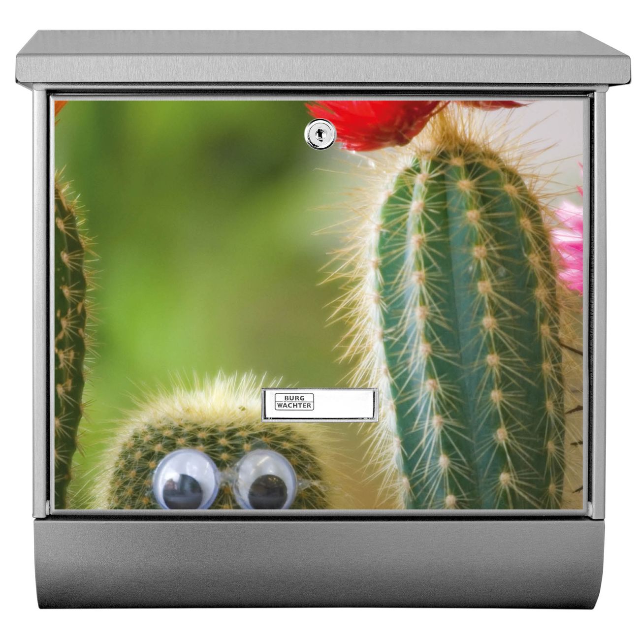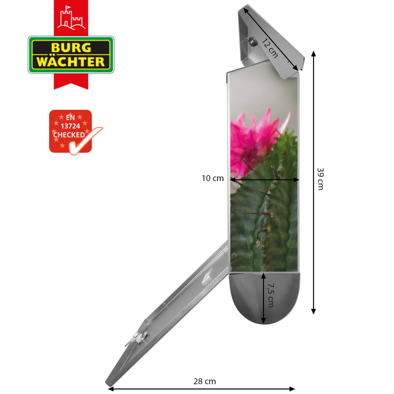 Der BURG-WÄCHTER Edelstahl Briefkasten mit Motiv Kakteen und Zeitungsrolle bietet Ihnen mit seinem Fassungsvermögen genügend Platz auch für große A4 Sendungen und Zeitschriften. Das integrierte Regendach schützt Ihre Post vor dem Eindringen von Regen.