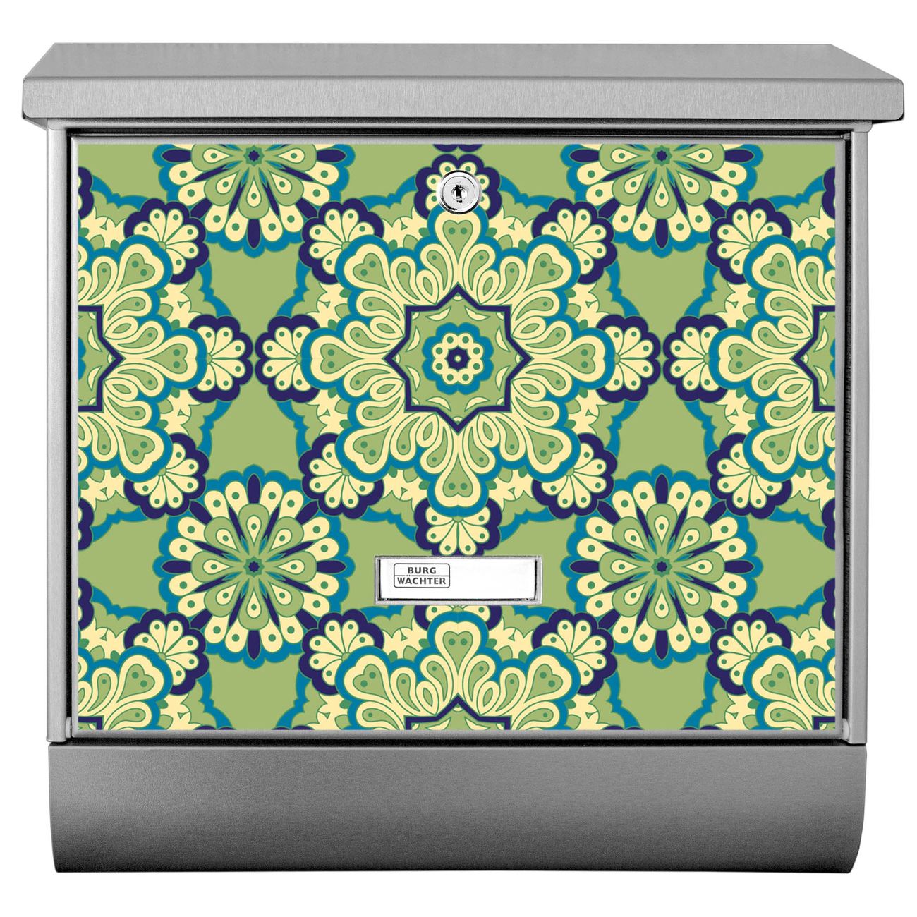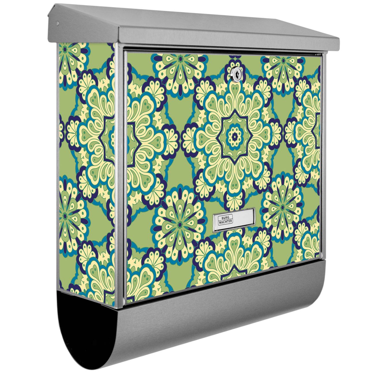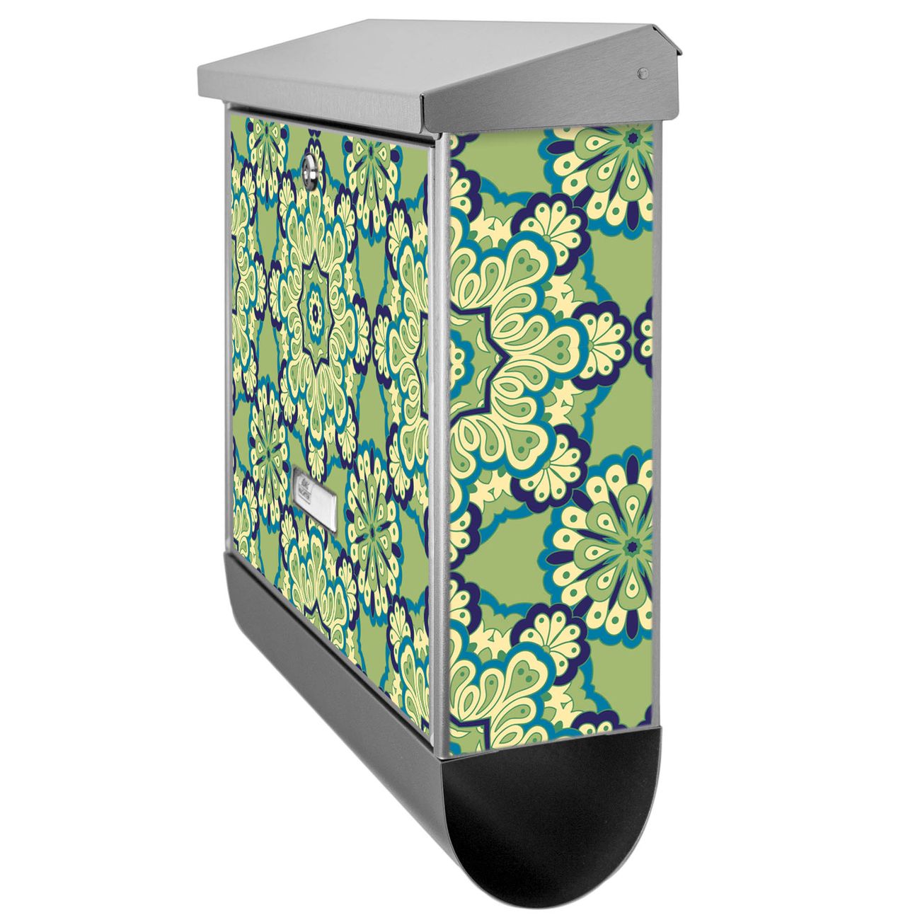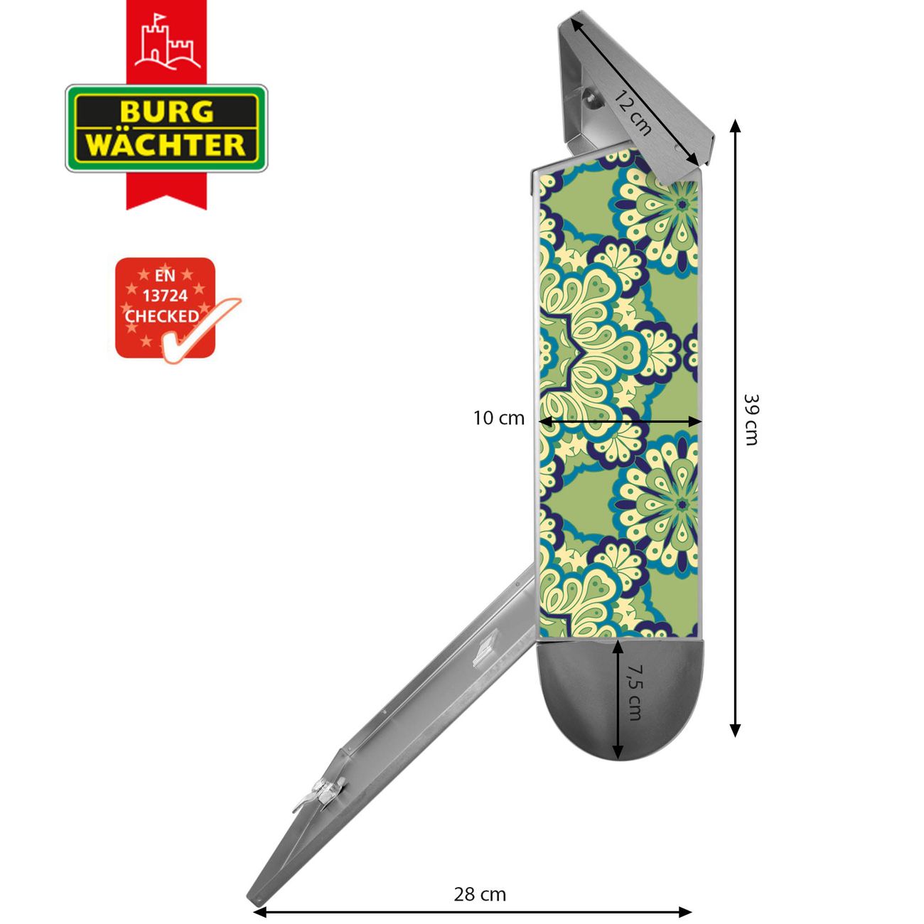 Der BURG-WÄCHTER Edelstahl Briefkasten mit Motiv Kaleidoscop Grün und Zeitungsrolle bietet Ihnen mit seinem Fassungsvermögen genügend Platz auch für große A4 Sendungen und Zeitschriften. Das integrierte Regendach schützt Ihre Post vor dem Eindringen von Regen.