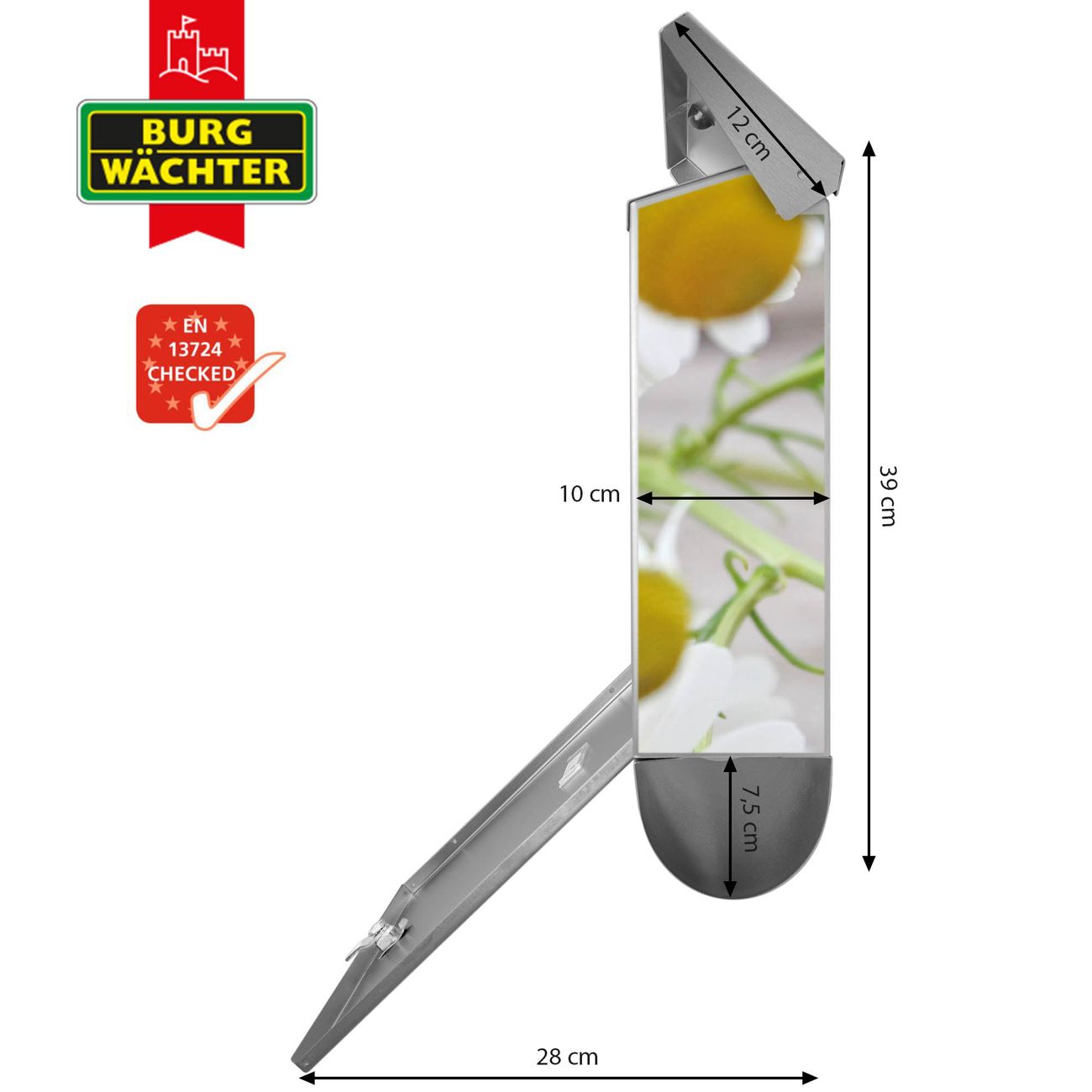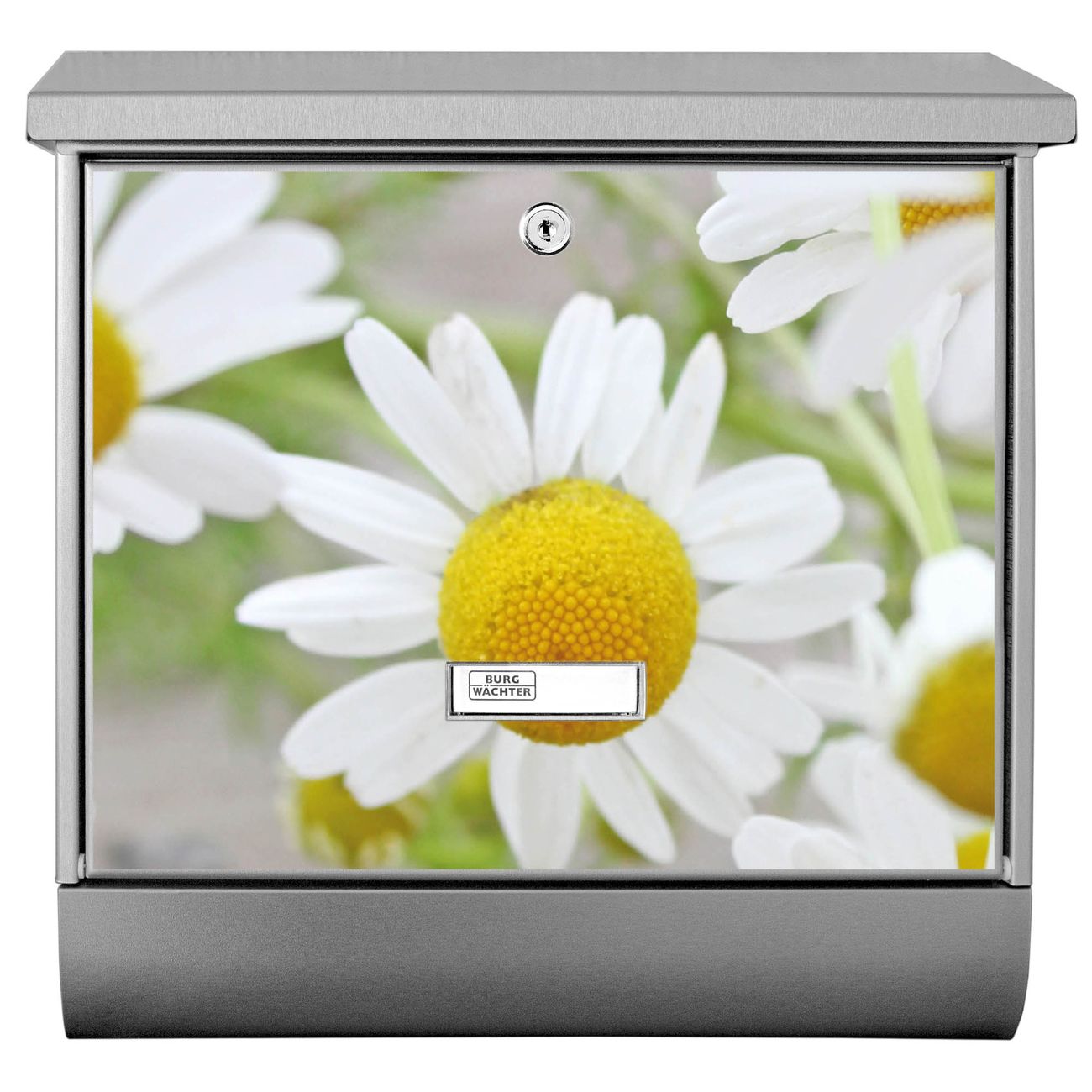 Der BURG-WÄCHTER Edelstahl Briefkasten mit Motiv Kamillenblüten und Zeitungsrolle bietet Ihnen mit seinem Fassungsvermögen genügend Platz auch für große A4 Sendungen und Zeitschriften. Das integrierte Regendach schützt Ihre Post vor dem Eindringen von Regen.