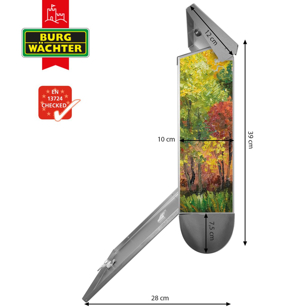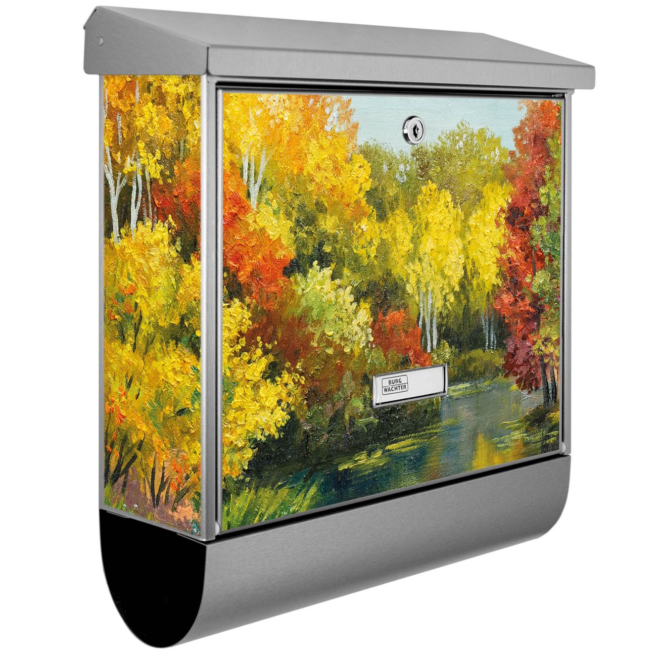 Der BURG-WÄCHTER Edelstahl Briefkasten mit Motiv Kanal Im Herbst und Zeitungsrolle bietet Ihnen mit seinem Fassungsvermögen genügend Platz auch für große A4 Sendungen und Zeitschriften. Das integrierte Regendach schützt Ihre Post vor dem Eindringen von Regen.
