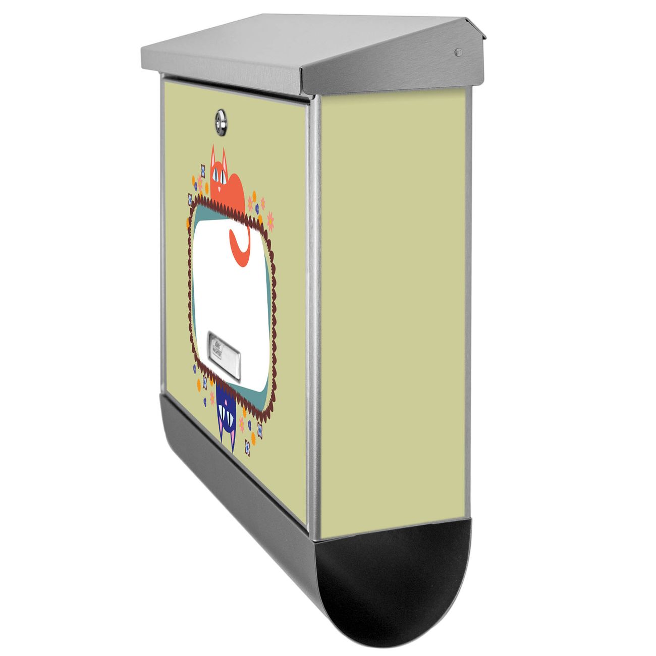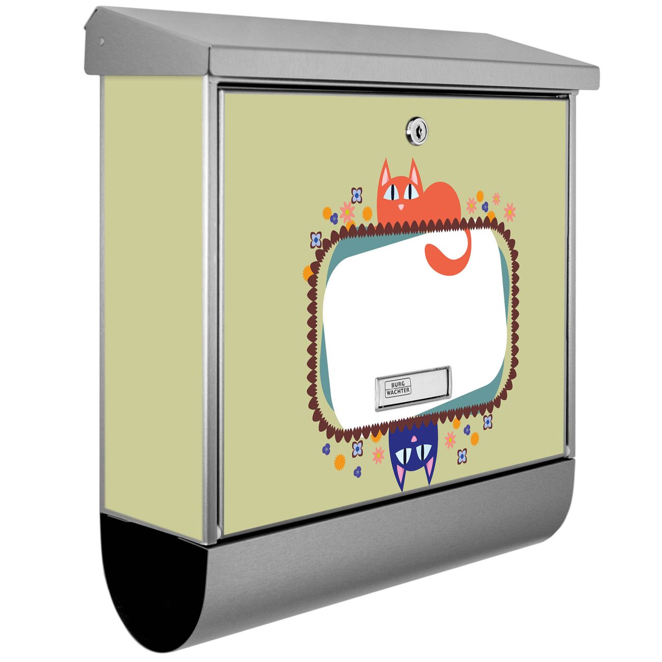 Der BURG-WÄCHTER Edelstahl Briefkasten mit Motiv Karikatur Katzen und Zeitungsrolle bietet Ihnen mit seinem Fassungsvermögen genügend Platz auch für große A4 Sendungen und Zeitschriften. Das integrierte Regendach schützt Ihre Post vor dem Eindringen von Regen.