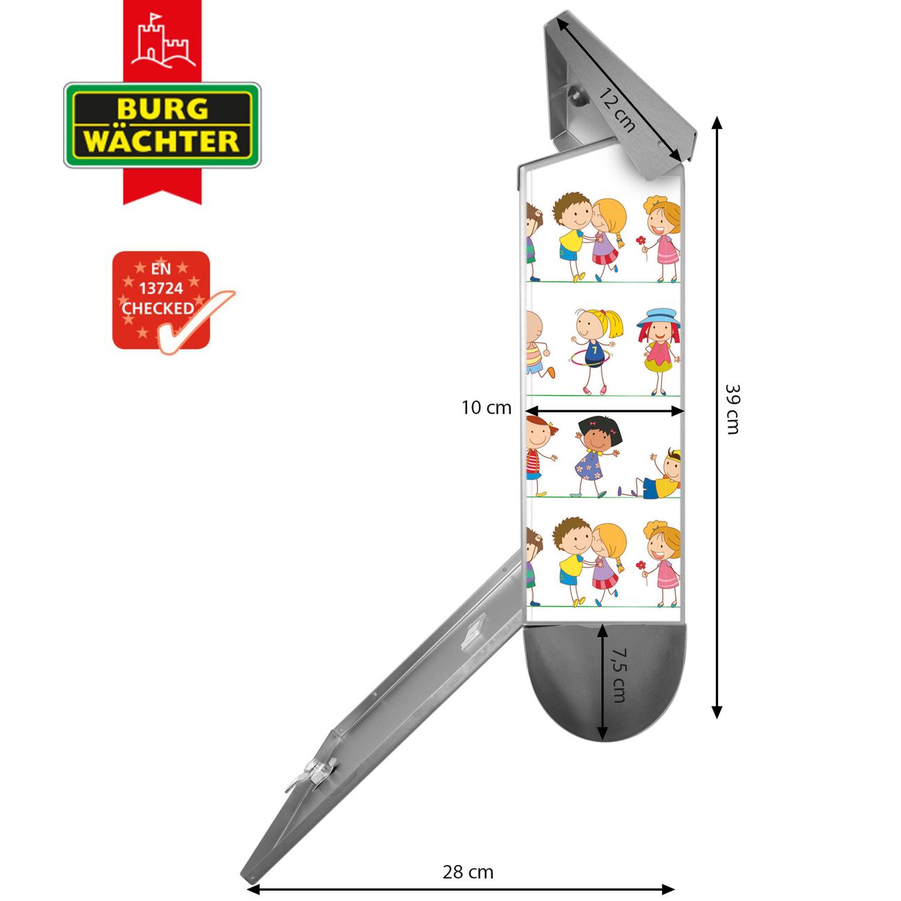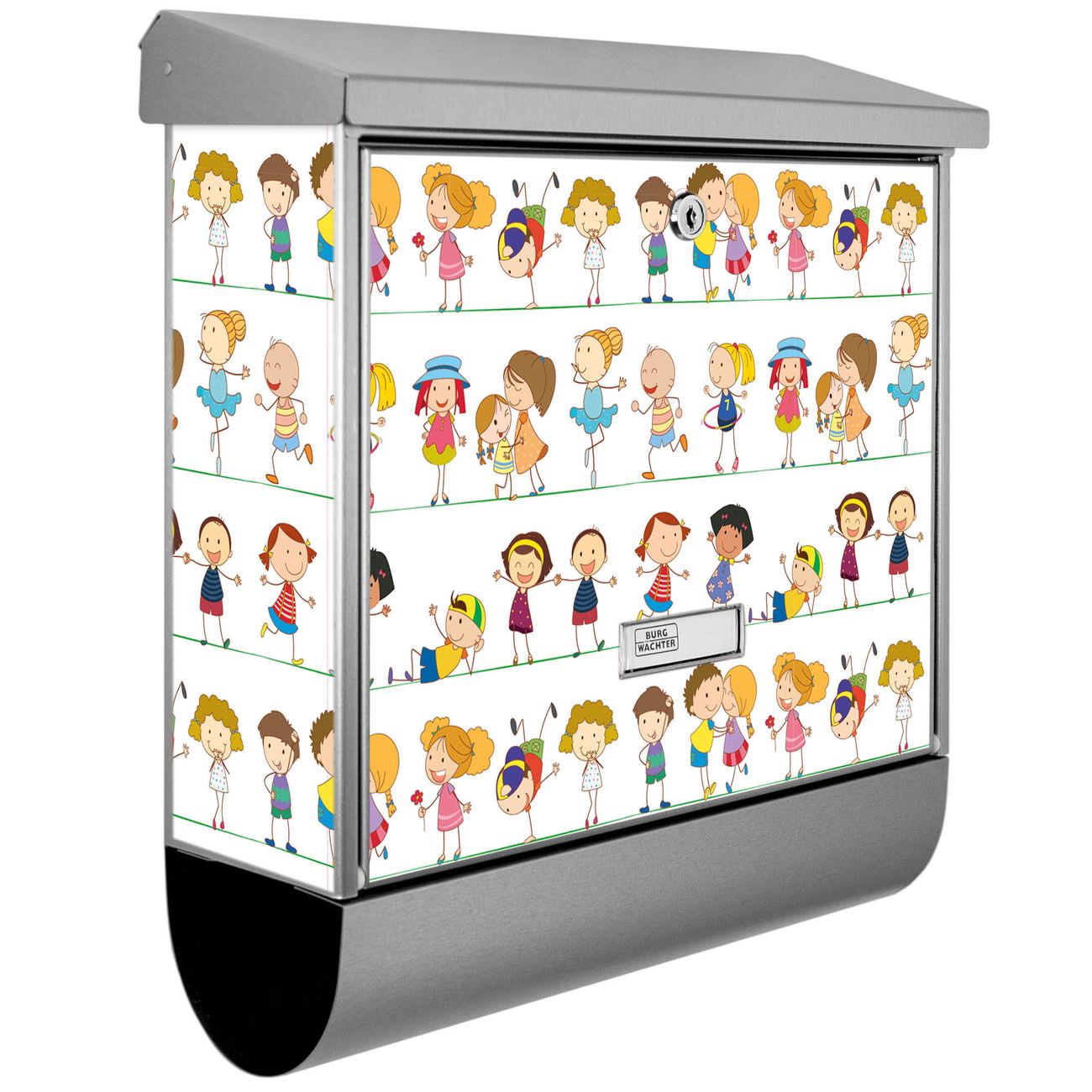 Der BURG-WÄCHTER Edelstahl Briefkasten mit Motiv Kinder und Zeitungsrolle bietet Ihnen mit seinem Fassungsvermögen genügend Platz auch für große A4 Sendungen und Zeitschriften. Das integrierte Regendach schützt Ihre Post vor dem Eindringen von Regen.