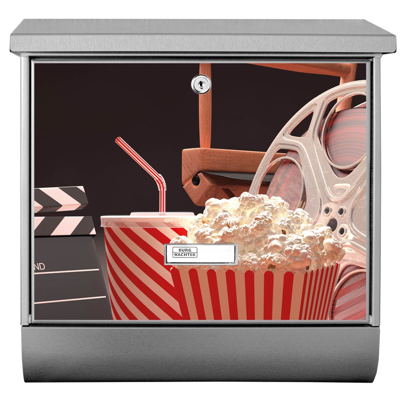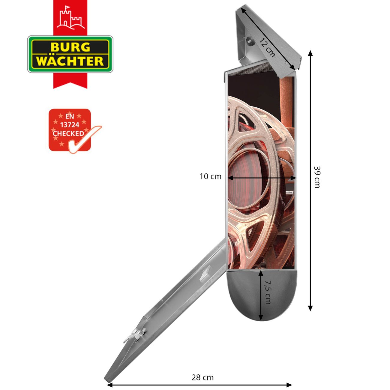 Der BURG-WÄCHTER Edelstahl Briefkasten mit Motiv Kino und Zeitungsrolle bietet Ihnen mit seinem Fassungsvermögen genügend Platz auch für große A4 Sendungen und Zeitschriften. Das integrierte Regendach schützt Ihre Post vor dem Eindringen von Regen.