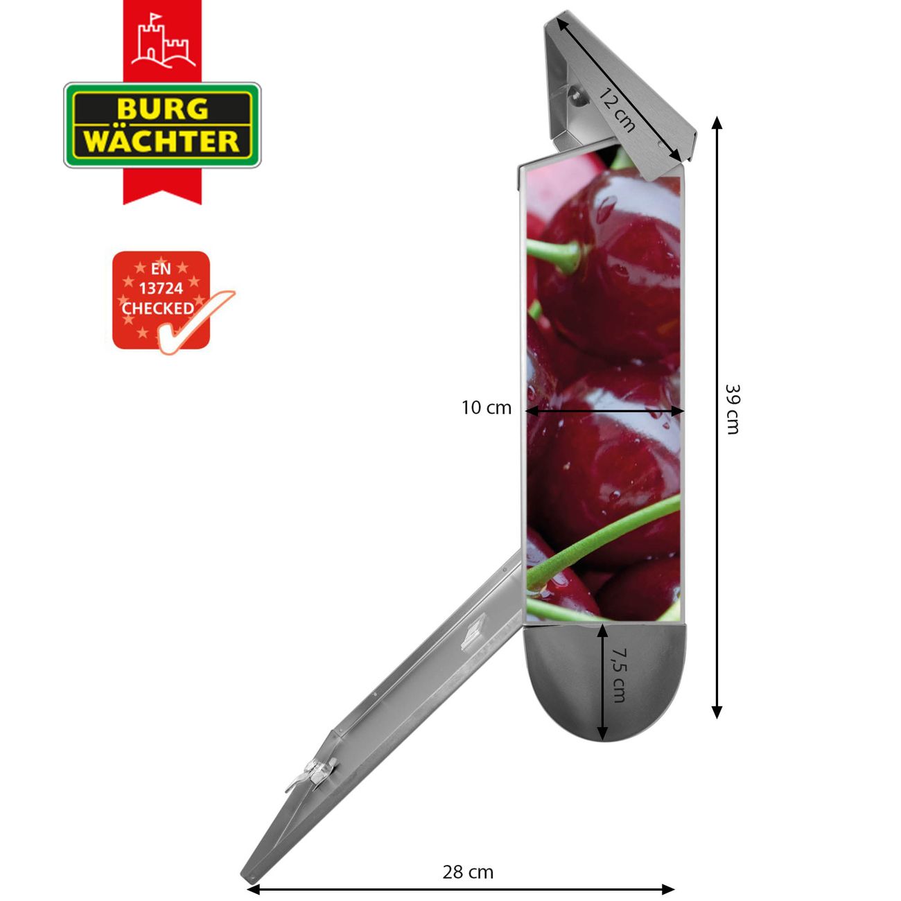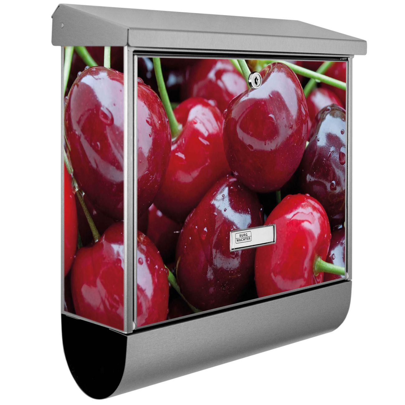 Der BURG-WÄCHTER Edelstahl Briefkasten mit Motiv Kirschen und Zeitungsrolle bietet Ihnen mit seinem Fassungsvermögen genügend Platz auch für große A4 Sendungen und Zeitschriften. Das integrierte Regendach schützt Ihre Post vor dem Eindringen von Regen.