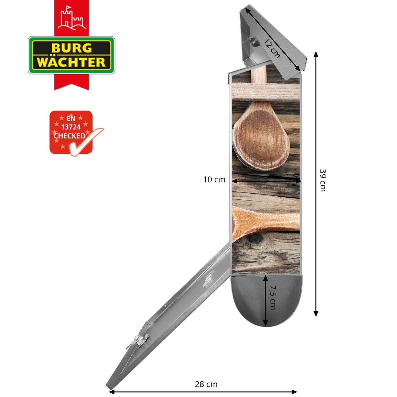 Der BURG-WÄCHTER Edelstahl Briefkasten mit Motiv Kochlöffel und Zeitungsrolle bietet Ihnen mit seinem Fassungsvermögen genügend Platz auch für große A4 Sendungen und Zeitschriften. Das integrierte Regendach schützt Ihre Post vor dem Eindringen von Regen.