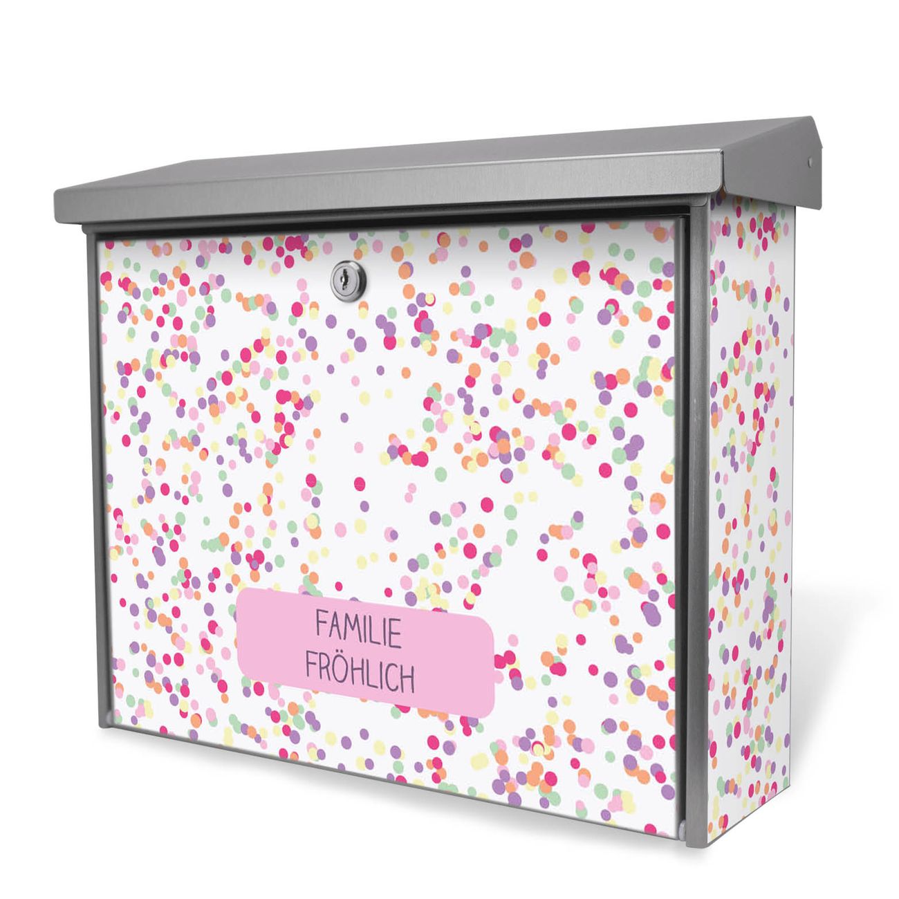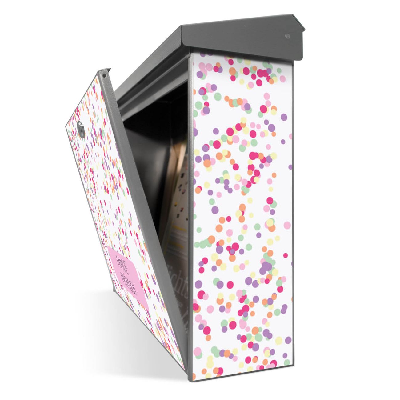 Der Postkasten mit Konfettiregen Motiv hat ein sehr ansprechendes und zeitloses Design. Unsere Motivpalette hält jede Menge Varianten bereit, ob klassisch, modern, verspielt oder witzig - für jeden haben wir das passende Motiv parat. Der Briefkasten ist das Aushängeschild Ihres Hauses.