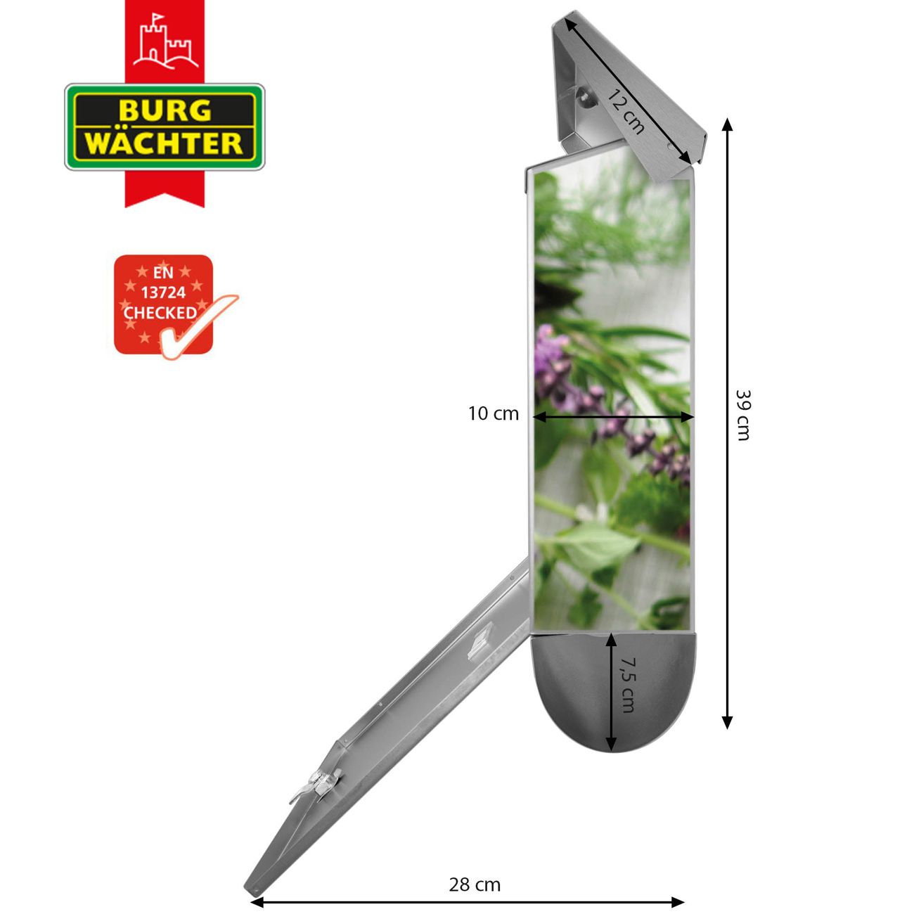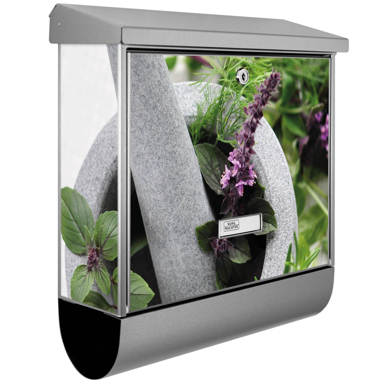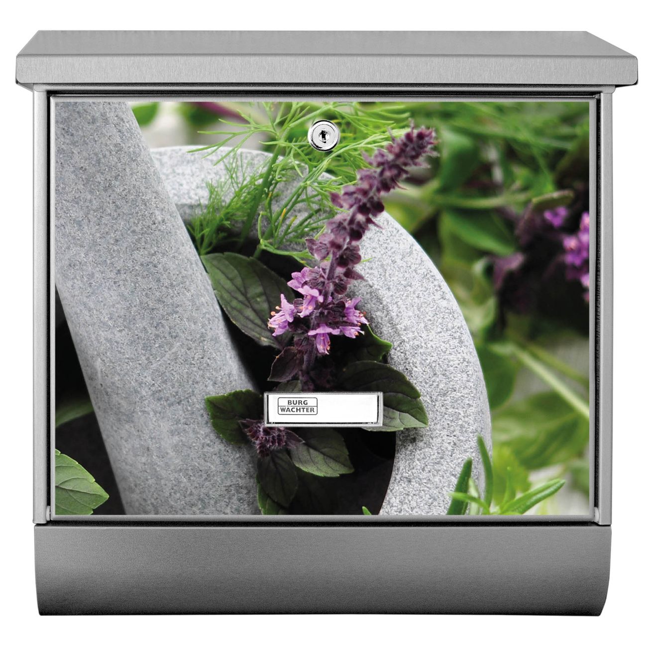 Der BURG-WÄCHTER Edelstahl Briefkasten mit Motiv Kräuter und Zeitungsrolle bietet Ihnen mit seinem Fassungsvermögen genügend Platz auch für große A4 Sendungen und Zeitschriften. Das integrierte Regendach schützt Ihre Post vor dem Eindringen von Regen.