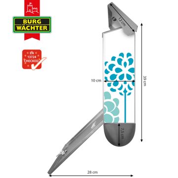 Der BURG-WÄCHTER Edelstahl Briefkasten mit Motiv Kräuterwiese und Zeitungsrolle bietet Ihnen mit seinem Fassungsvermögen genügend Platz auch für große A4 Sendungen und Zeitschriften. Das integrierte Regendach schützt Ihre Post vor dem Eindringen von Regen.