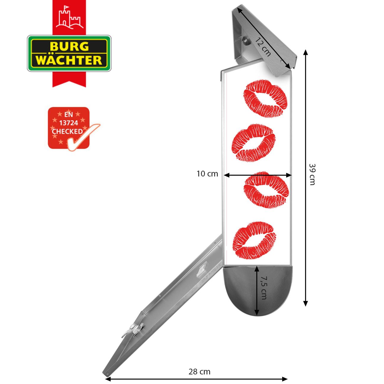 Der BURG-WÄCHTER Edelstahl Briefkasten mit Motiv Kussmund und Zeitungsrolle bietet Ihnen mit seinem Fassungsvermögen genügend Platz auch für große A4 Sendungen und Zeitschriften. Das integrierte Regendach schützt Ihre Post vor dem Eindringen von Regen.