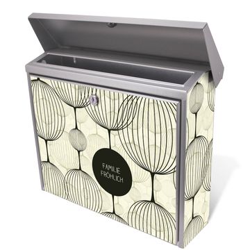 Der Briefkasten besteht aus Edelstahl, einem hochwertigen Material das witterungsbeständig ist. Das Motiv besteht aus einer wetter- und UV-festen Folie, die Ihren Briefkasten zusätzlich vor Kratzern schützt. Der Postkasten ist 31,5cm hoch, 38,5cm breit und 12cm tief. Der Briefeinwurf ist 33,2cm x 2,7cm, Format DIN C4. Der Briefkasten wird mit Montagematerial und zwei Schlüsseln geliefert.