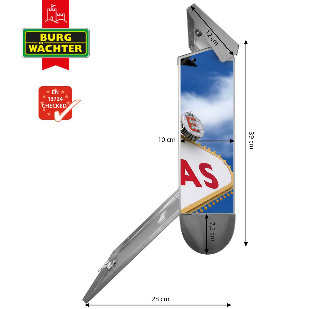 Der BURG-WÄCHTER Edelstahl Briefkasten mit Motiv Las Vegas und Zeitungsrolle bietet Ihnen mit seinem Fassungsvermögen genügend Platz auch für große A4 Sendungen und Zeitschriften. Das integrierte Regendach schützt Ihre Post vor dem Eindringen von Regen.