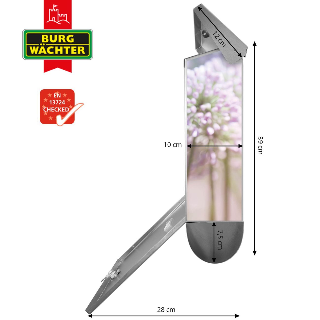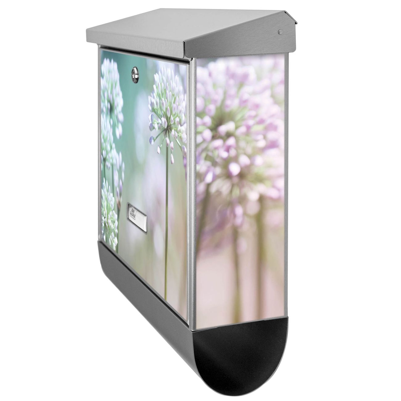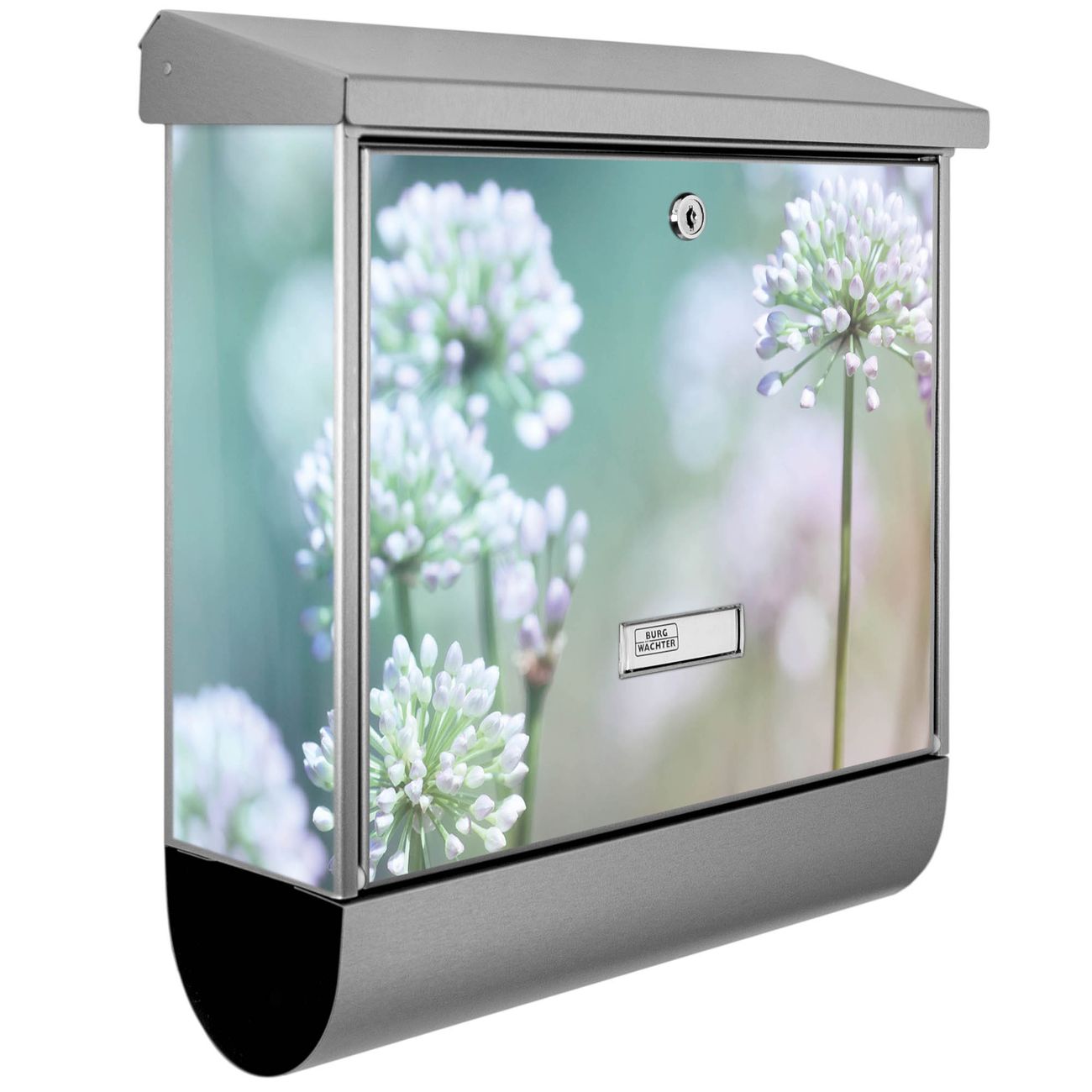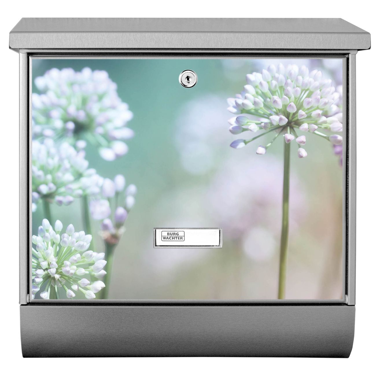 Der BURG-WÄCHTER Edelstahl Briefkasten mit Motiv Lauchblüte und Zeitungsrolle bietet Ihnen mit seinem Fassungsvermögen genügend Platz auch für große A4 Sendungen und Zeitschriften. Das integrierte Regendach schützt Ihre Post vor dem Eindringen von Regen.