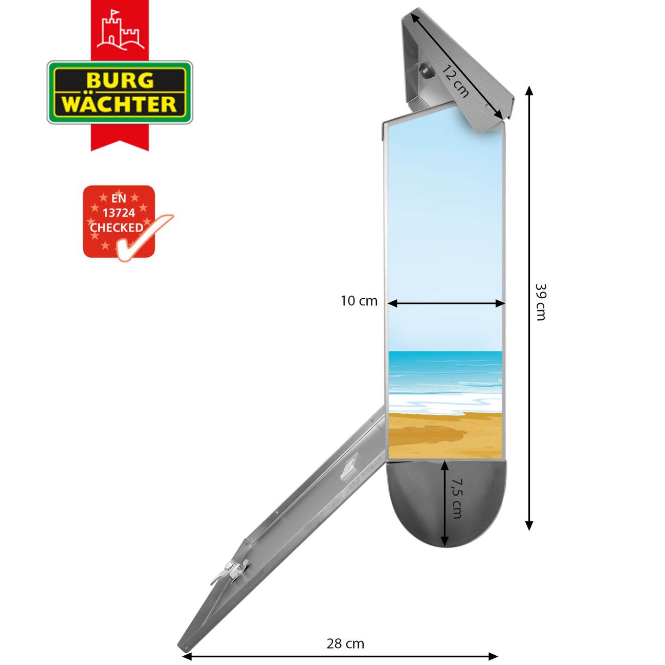 Der BURG-WÄCHTER Edelstahl Briefkasten mit Motiv Leuchtturm Illustration und Zeitungsrolle bietet Ihnen mit seinem Fassungsvermögen genügend Platz auch für große A4 Sendungen und Zeitschriften. Das integrierte Regendach schützt Ihre Post vor dem Eindringen von Regen.