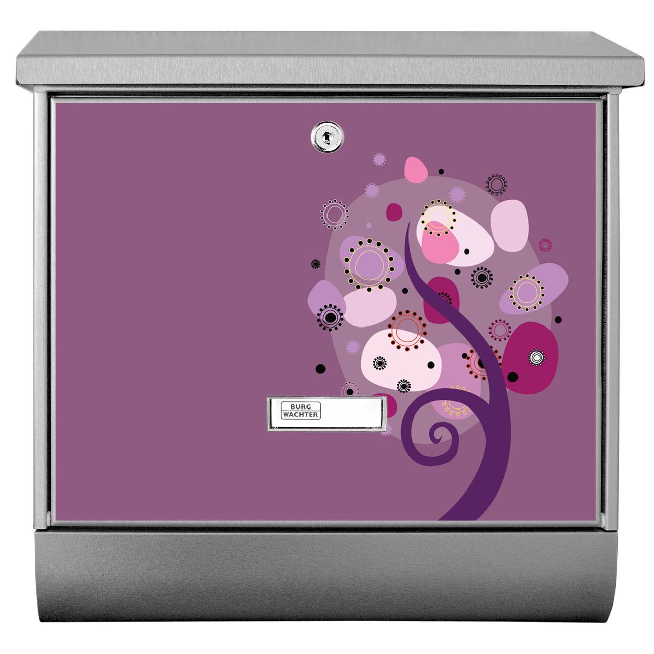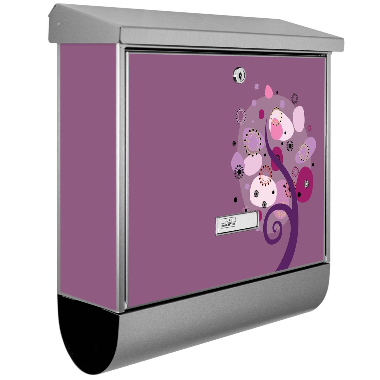 Der BURG-WÄCHTER Edelstahl Briefkasten mit Motiv Lila Baum und Zeitungsrolle bietet Ihnen mit seinem Fassungsvermögen genügend Platz auch für große A4 Sendungen und Zeitschriften. Das integrierte Regendach schützt Ihre Post vor dem Eindringen von Regen.