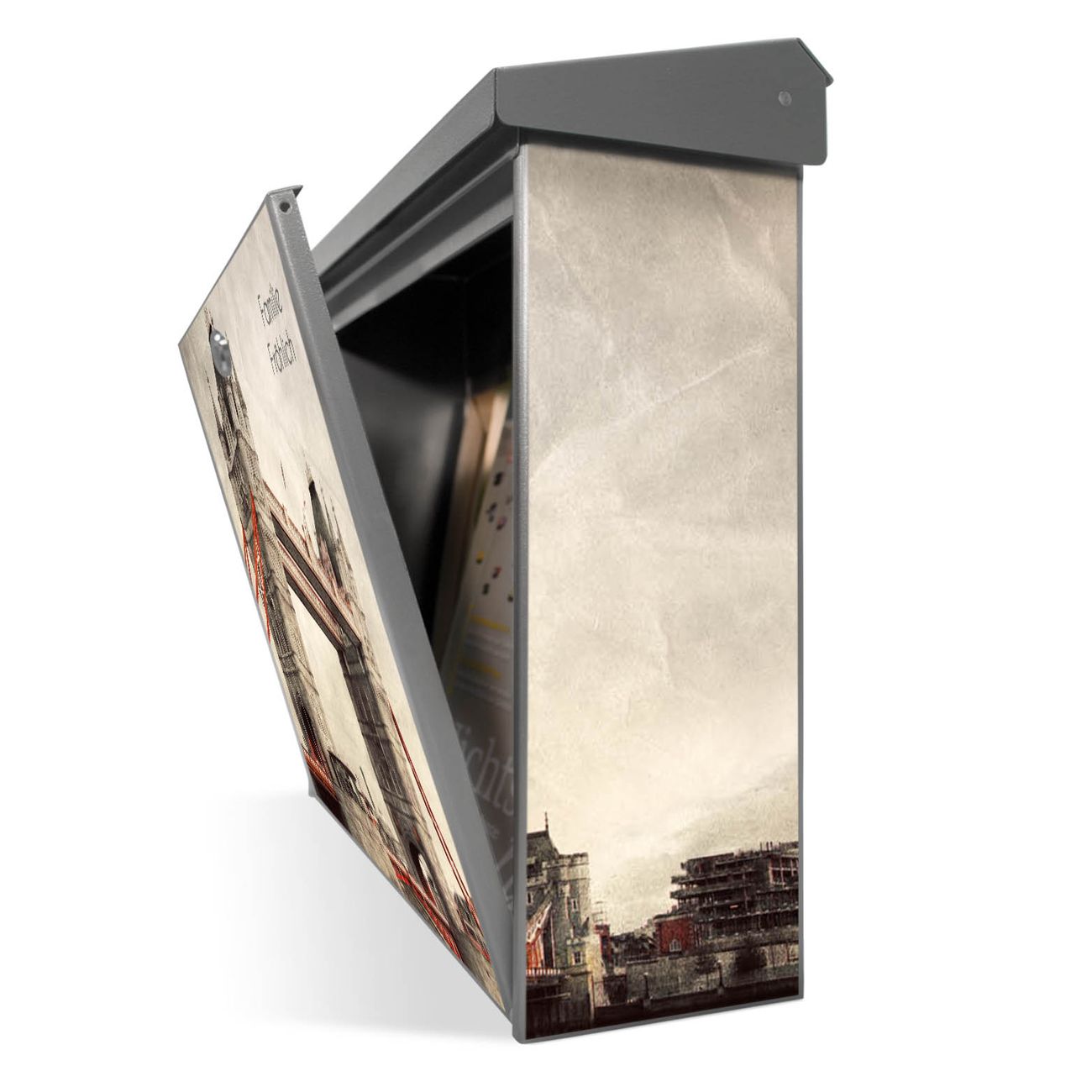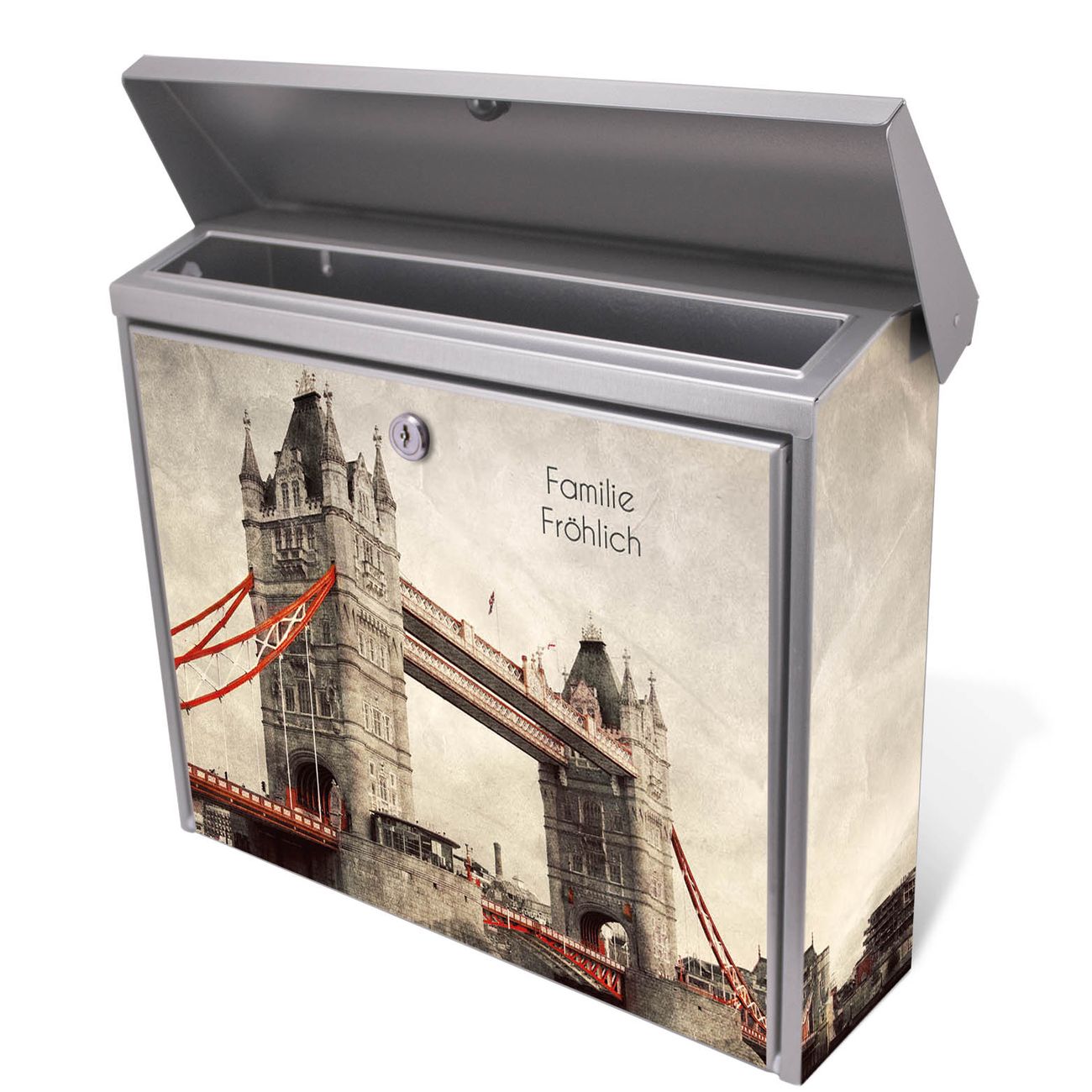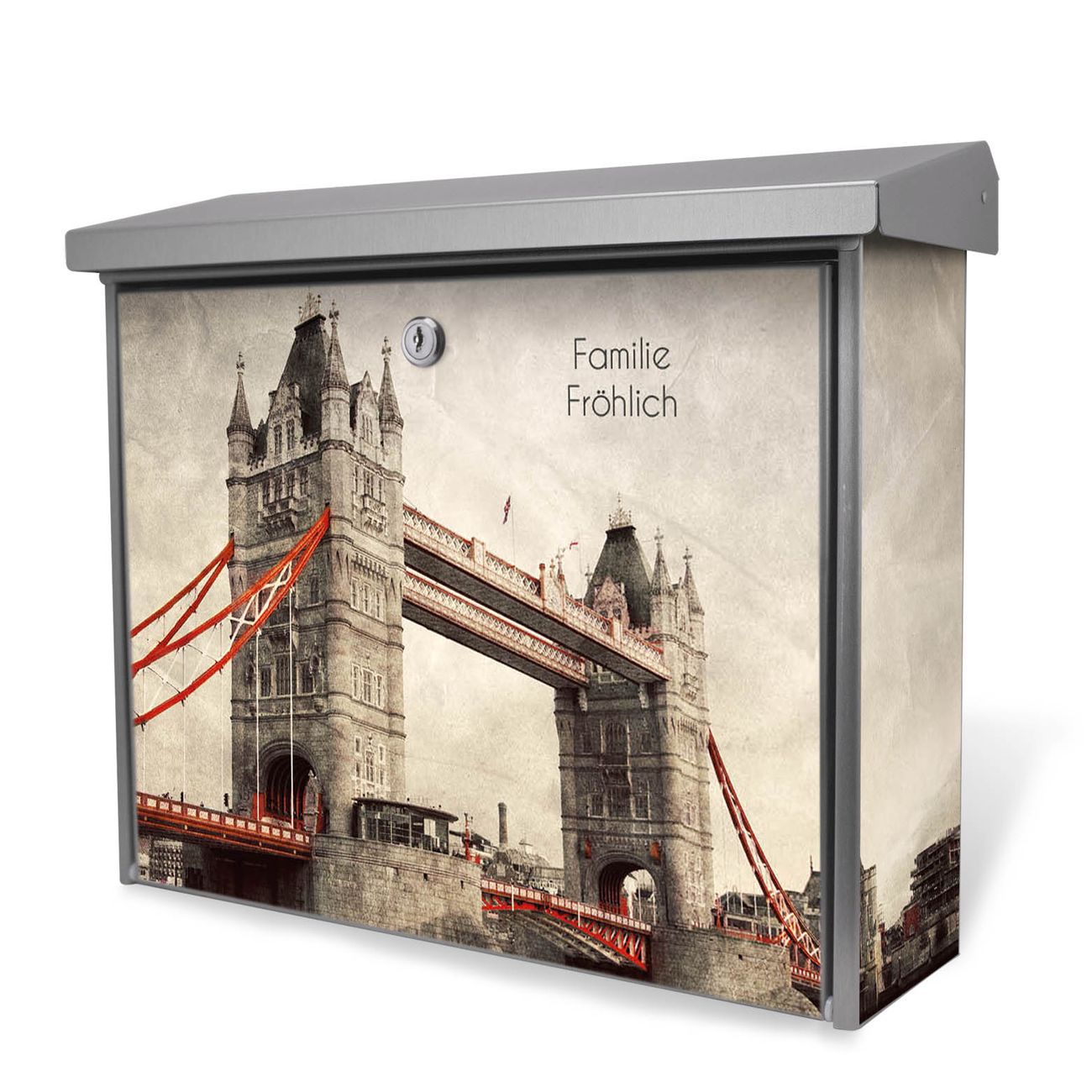 Der Postkasten mit London Bridge Motiv hat ein sehr ansprechendes und zeitloses Design. Unsere Motivpalette hält jede Menge Varianten bereit, ob klassisch, modern, verspielt oder witzig - für jeden haben wir das passende Motiv parat. Der Briefkasten ist das Aushängeschild Ihres Hauses.