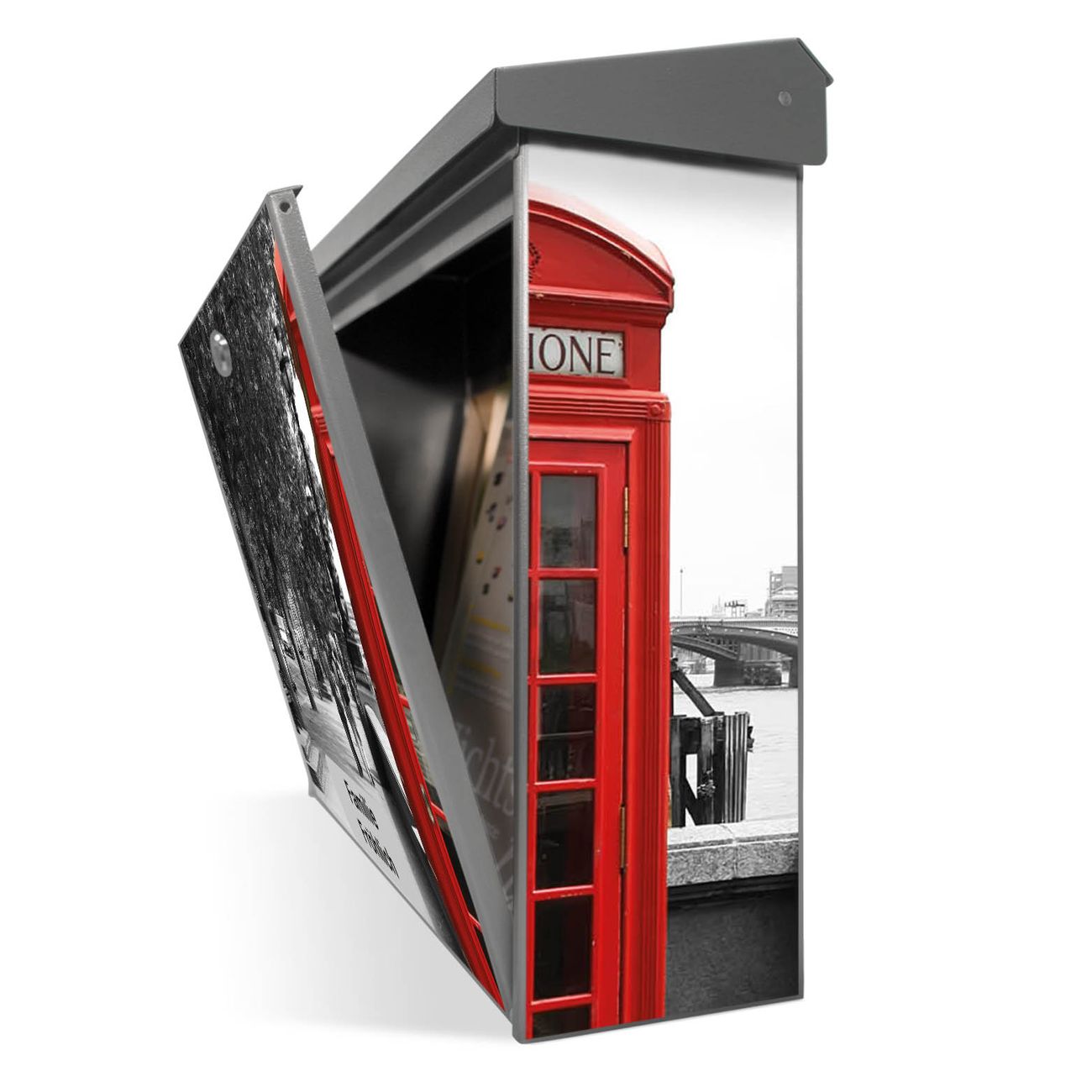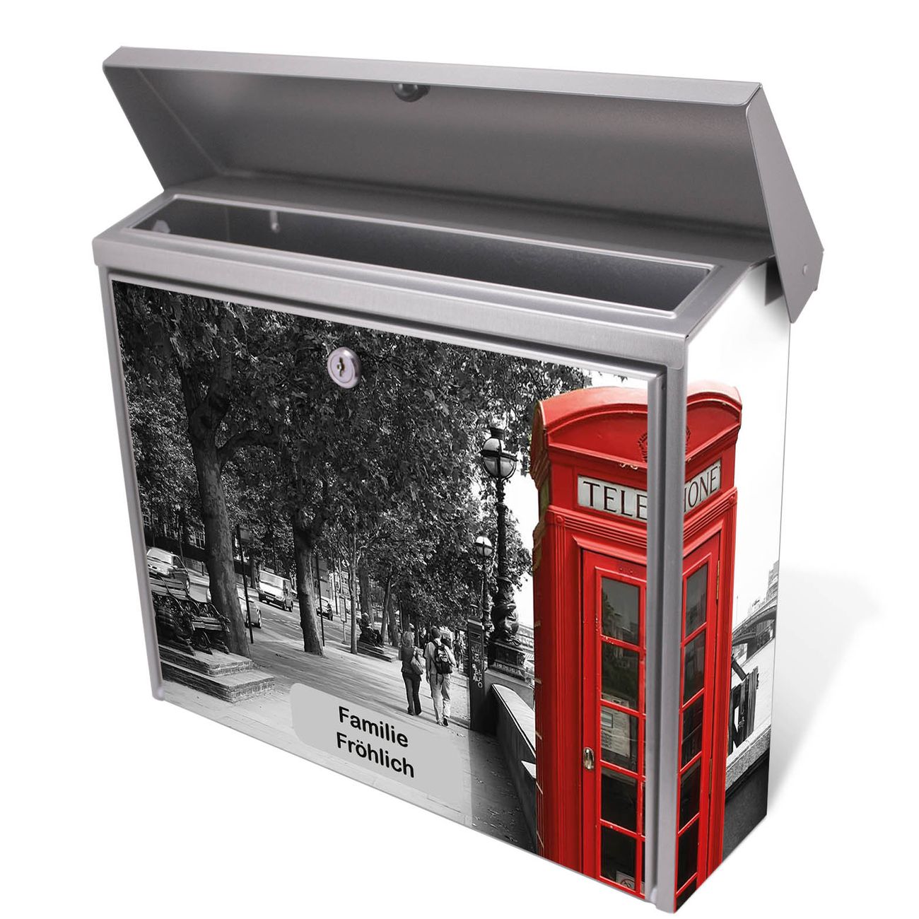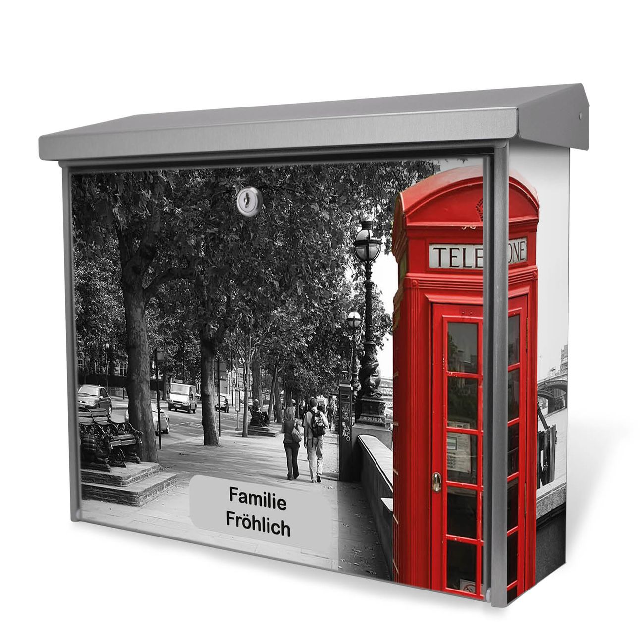 Der Postkasten mit London Red Telephone Motiv hat ein sehr ansprechendes und zeitloses Design. Unsere Motivpalette hält jede Menge Varianten bereit, ob klassisch, modern, verspielt oder witzig - für jeden haben wir das passende Motiv parat. Der Briefkasten ist das Aushängeschild Ihres Hauses.