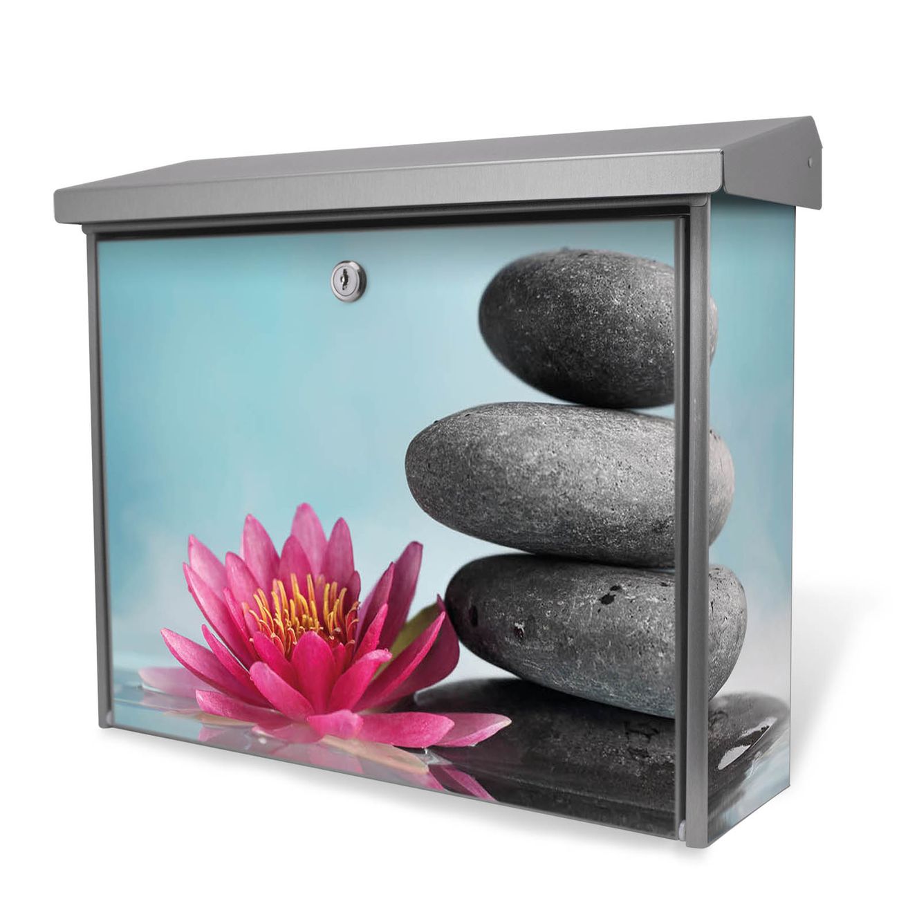 Der Postkasten mit Lotus Und Steine Motiv hat ein sehr ansprechendes und zeitloses Design. Unsere Motivpalette hält jede Menge Varianten bereit, ob klassisch, modern, verspielt oder witzig - für jeden haben wir das passende Motiv parat. Der Briefkasten ist das Aushängeschild Ihres Hauses.