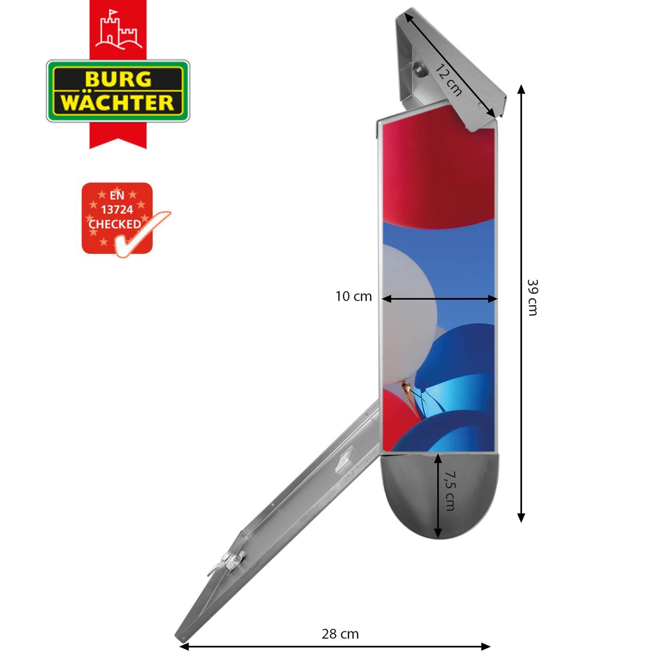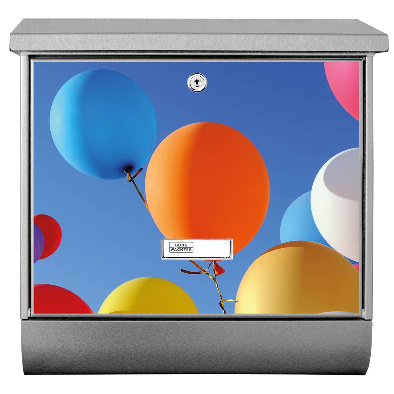 Der BURG-WÄCHTER Edelstahl Briefkasten mit Motiv Luftballons und Zeitungsrolle bietet Ihnen mit seinem Fassungsvermögen genügend Platz auch für große A4 Sendungen und Zeitschriften. Das integrierte Regendach schützt Ihre Post vor dem Eindringen von Regen.