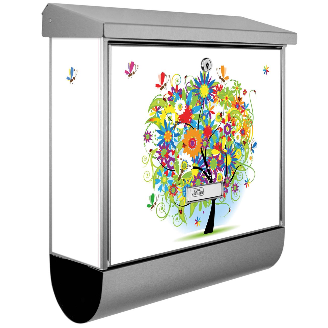 Der BURG-WÄCHTER Edelstahl Briefkasten mit Motiv Märchenzauberbaum und Zeitungsrolle bietet Ihnen mit seinem Fassungsvermögen genügend Platz auch für große A4 Sendungen und Zeitschriften. Das integrierte Regendach schützt Ihre Post vor dem Eindringen von Regen.