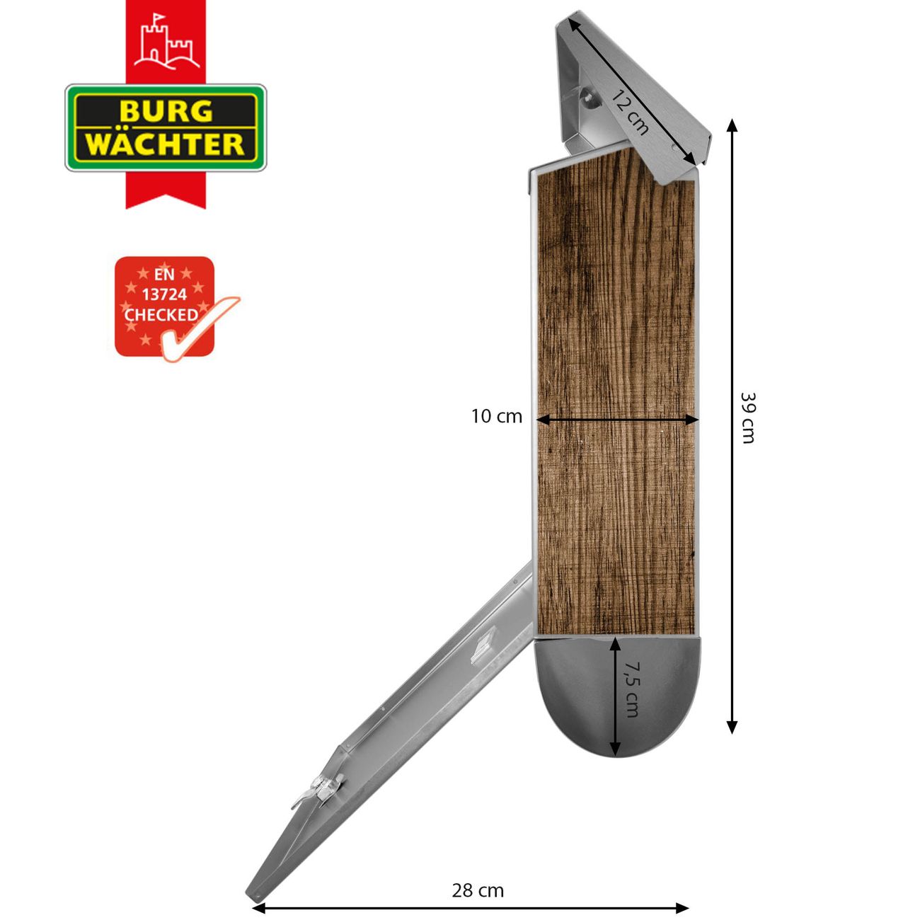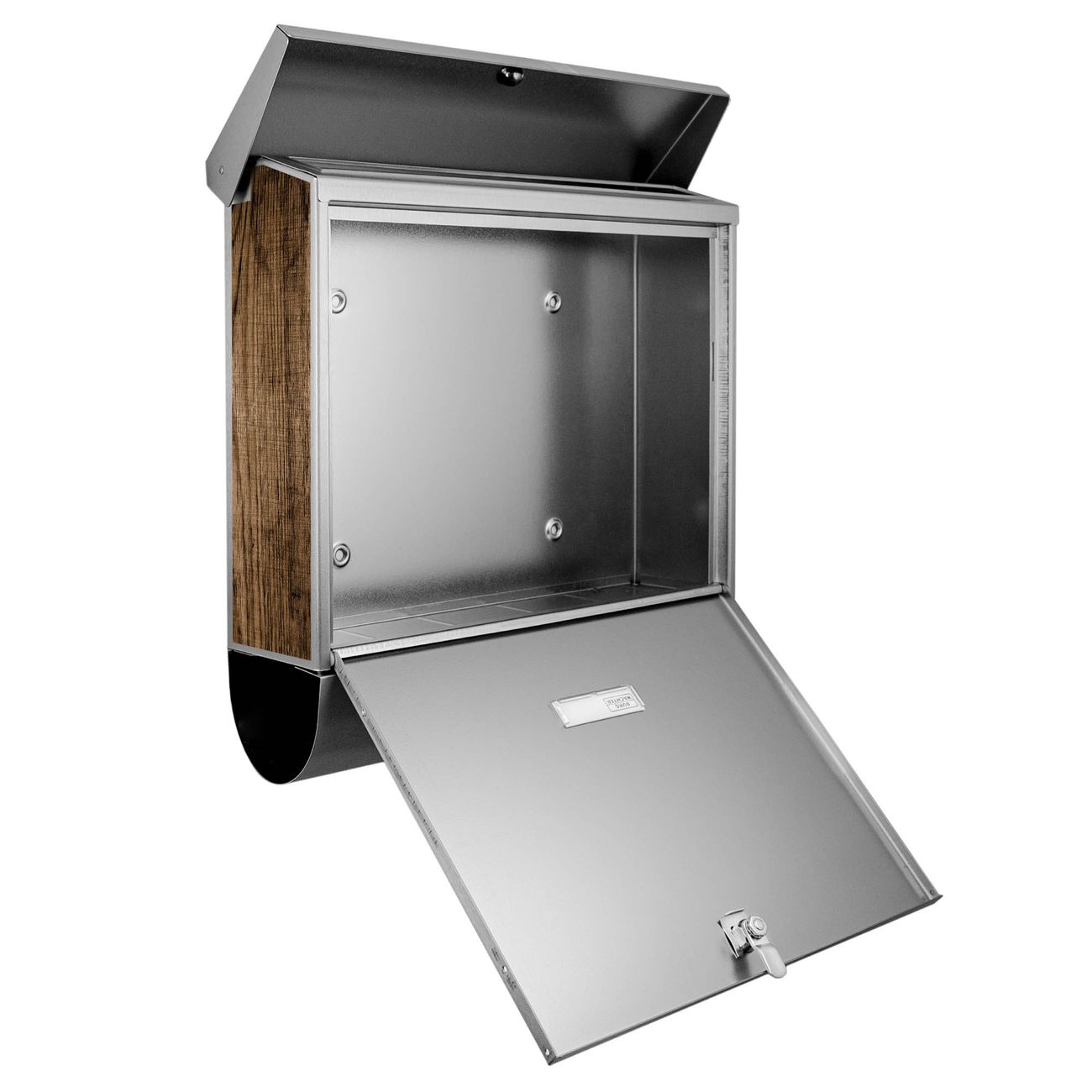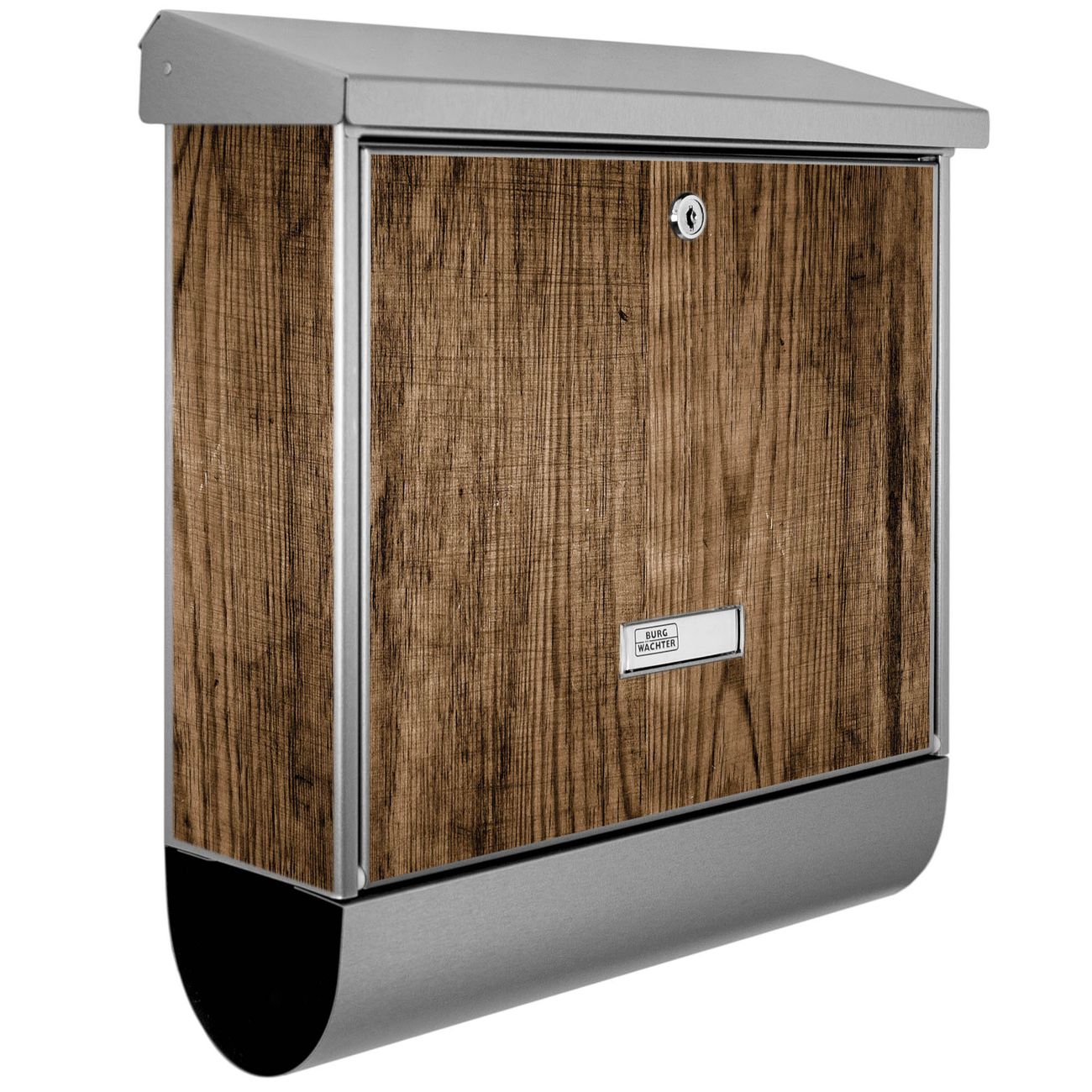 Der BURG-WÄCHTER Edelstahl Briefkasten mit Motiv Maserung Dunkel und Zeitungsrolle bietet Ihnen mit seinem Fassungsvermögen genügend Platz auch für große A4 Sendungen und Zeitschriften. Das integrierte Regendach schützt Ihre Post vor dem Eindringen von Regen.