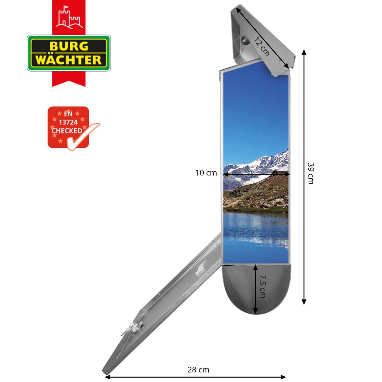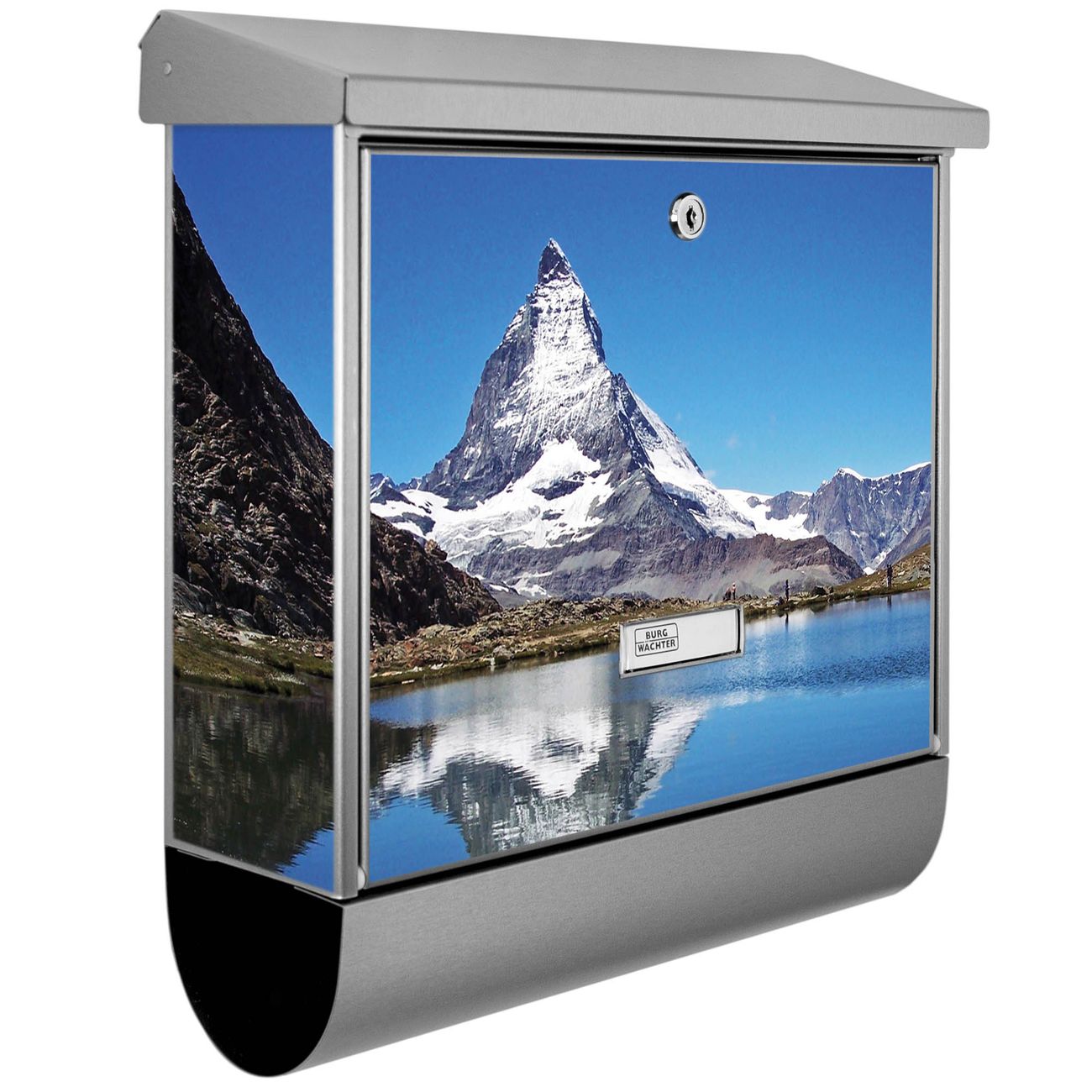Der BURG-WÄCHTER Edelstahl Briefkasten mit Motiv Matterhorn und Zeitungsrolle bietet Ihnen mit seinem Fassungsvermögen genügend Platz auch für große A4 Sendungen und Zeitschriften. Das integrierte Regendach schützt Ihre Post vor dem Eindringen von Regen.