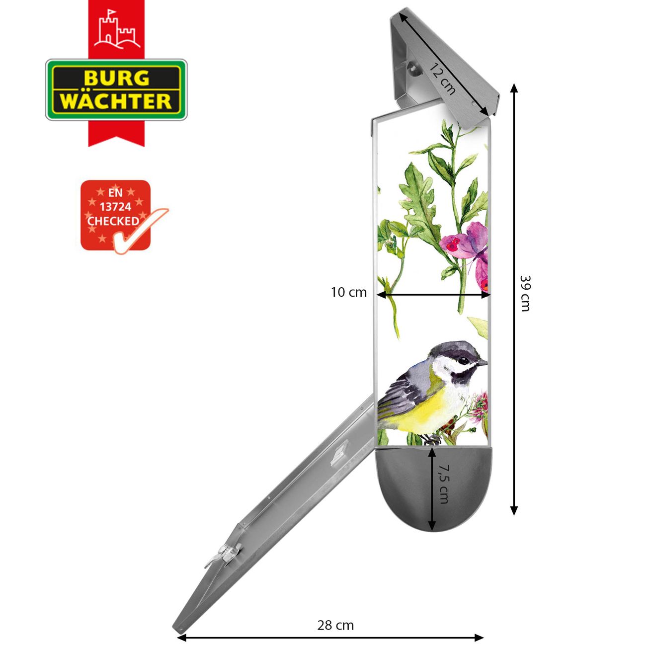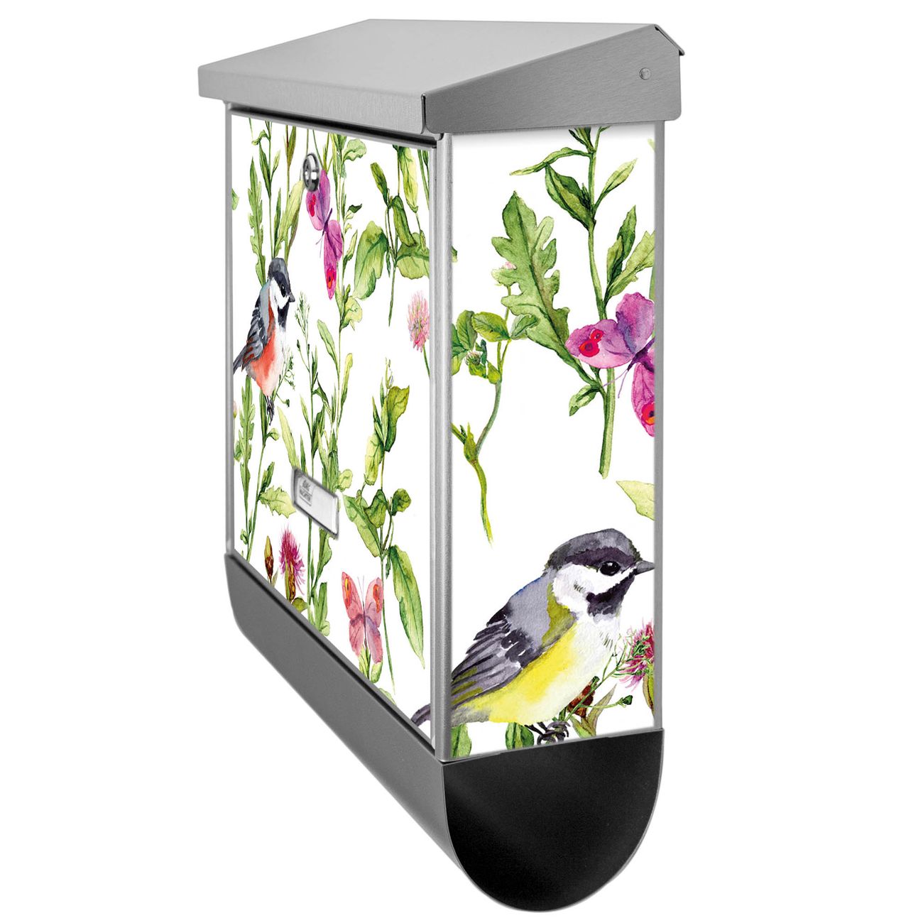 Der BURG-WÄCHTER Edelstahl Briefkasten mit Motiv Meisen im Klee und Zeitungsrolle bietet Ihnen mit seinem Fassungsvermögen genügend Platz auch für große A4 Sendungen und Zeitschriften. Das integrierte Regendach schützt Ihre Post vor dem Eindringen von Regen.