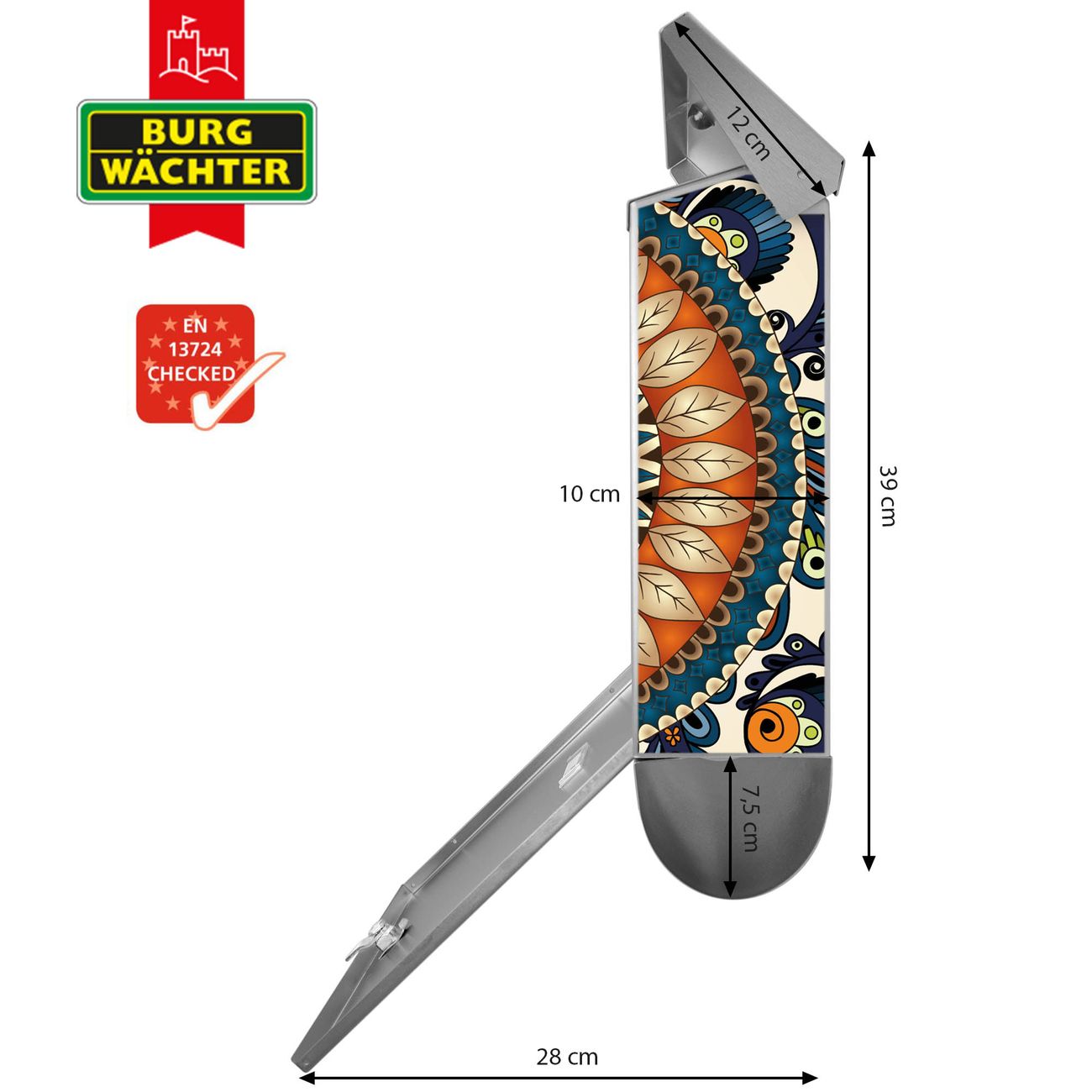 Der BURG-WÄCHTER Edelstahl Briefkasten mit Motiv Modernes Mandala und Zeitungsrolle bietet Ihnen mit seinem Fassungsvermögen genügend Platz auch für große A4 Sendungen und Zeitschriften. Das integrierte Regendach schützt Ihre Post vor dem Eindringen von Regen.