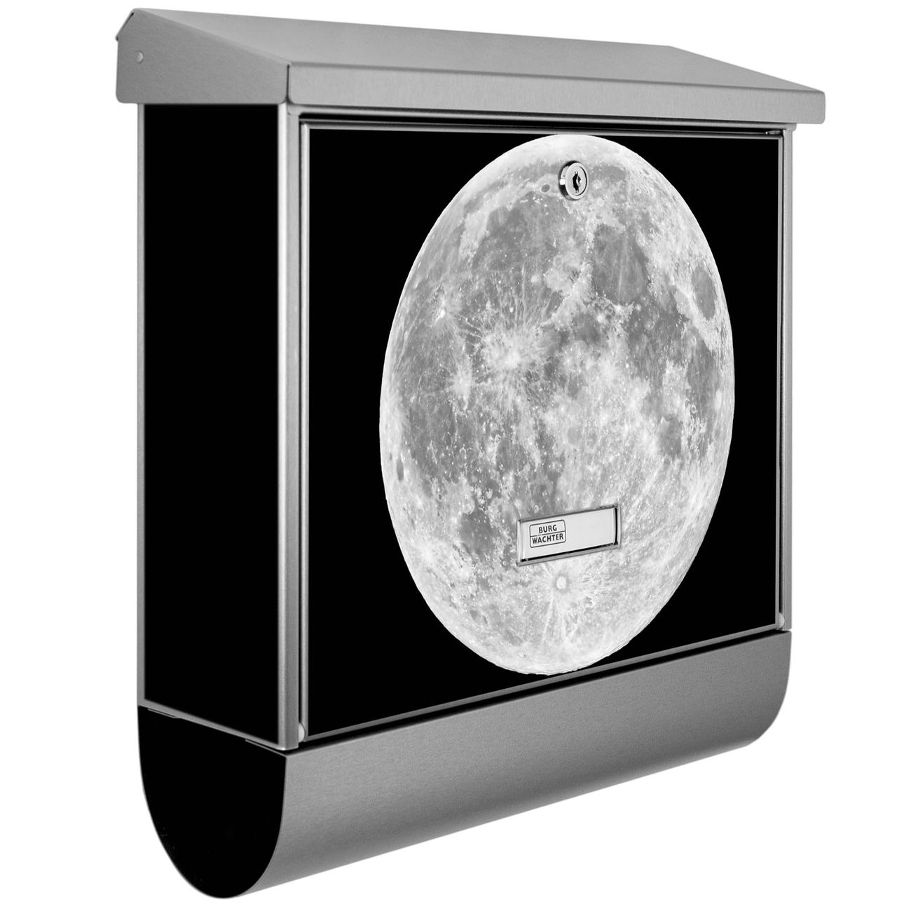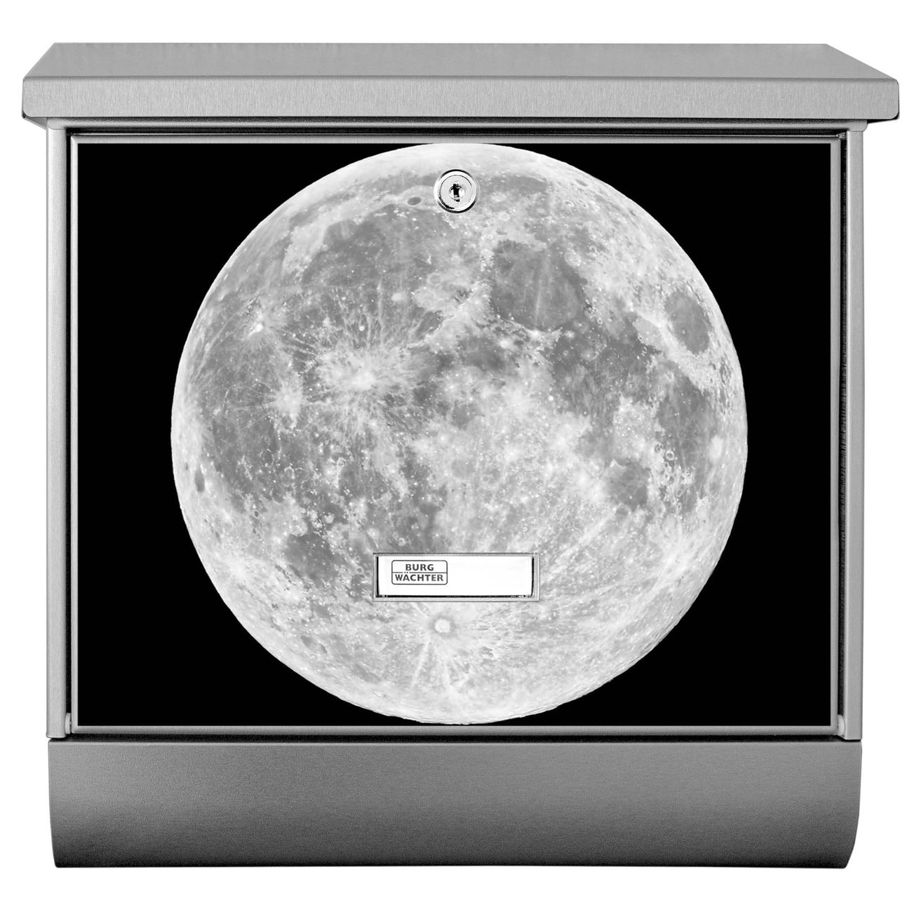 Der BURG-WÄCHTER Edelstahl Briefkasten mit Motiv Mond und Zeitungsrolle bietet Ihnen mit seinem Fassungsvermögen genügend Platz auch für große A4 Sendungen und Zeitschriften. Das integrierte Regendach schützt Ihre Post vor dem Eindringen von Regen.