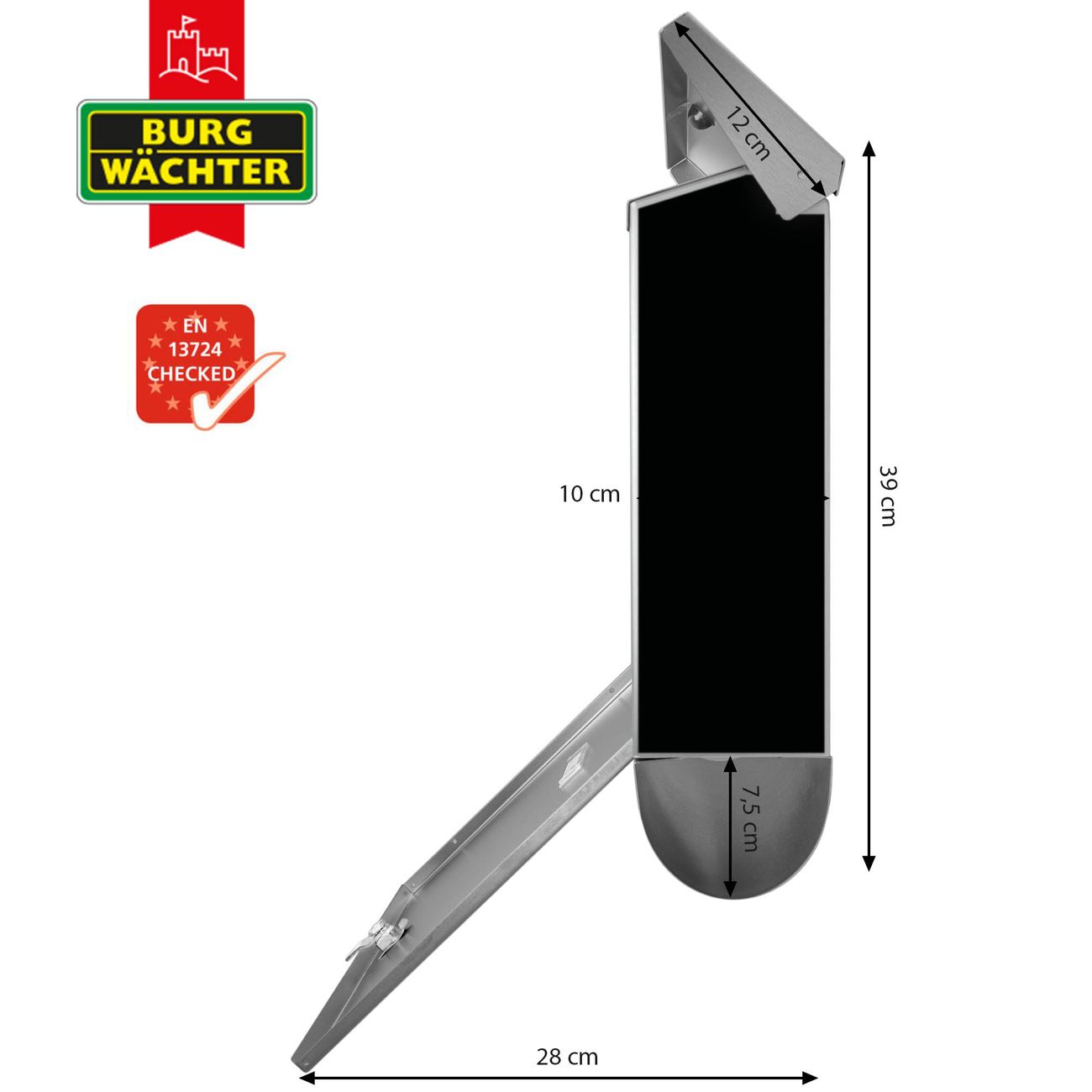 Der BURG-WÄCHTER Edelstahl Briefkasten mit Motiv Monique und Zeitungsrolle bietet Ihnen mit seinem Fassungsvermögen genügend Platz auch für große A4 Sendungen und Zeitschriften. Das integrierte Regendach schützt Ihre Post vor dem Eindringen von Regen.