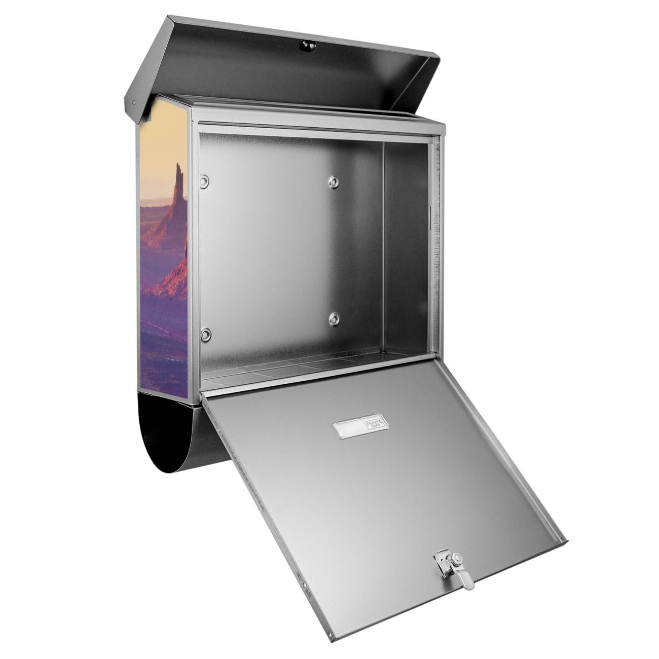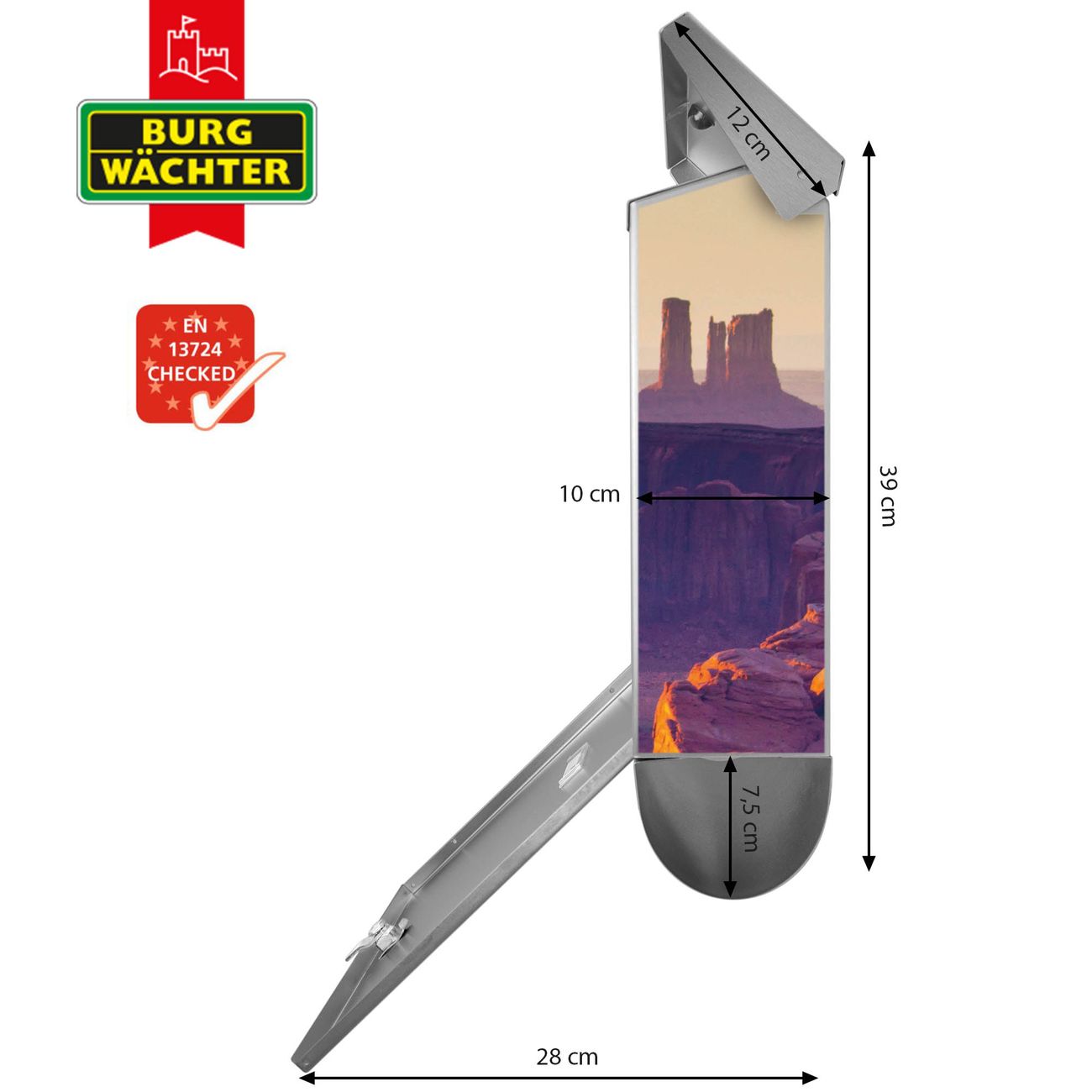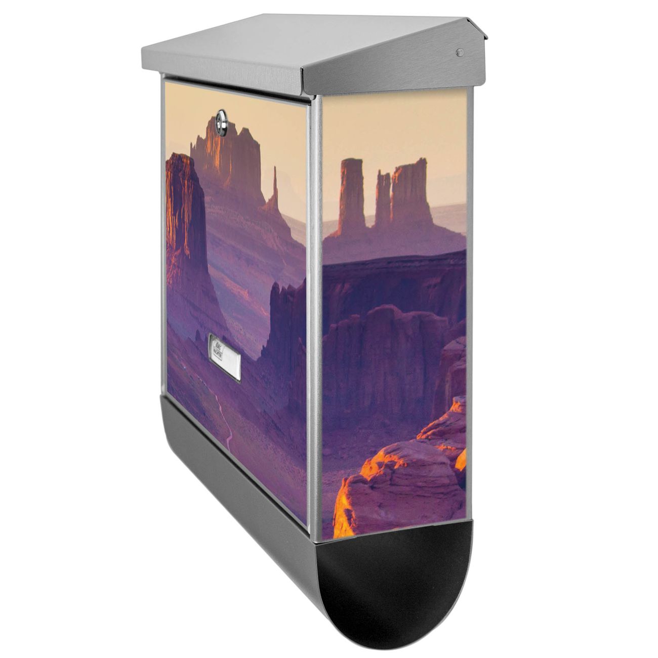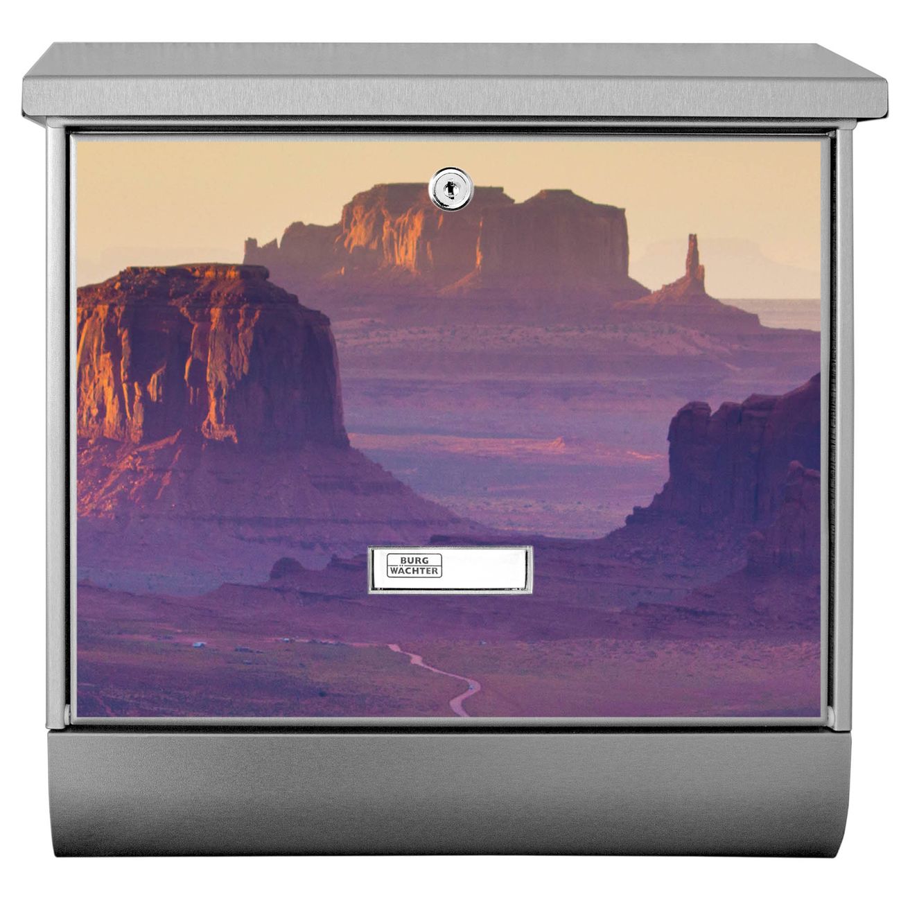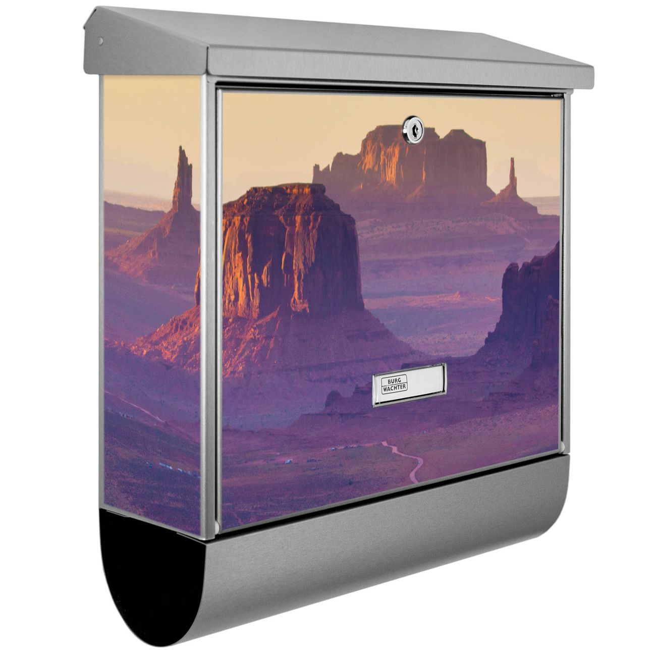 Der BURG-WÄCHTER Edelstahl Briefkasten mit Motiv Monument Valley und Zeitungsrolle bietet Ihnen mit seinem Fassungsvermögen genügend Platz auch für große A4 Sendungen und Zeitschriften. Das integrierte Regendach schützt Ihre Post vor dem Eindringen von Regen.