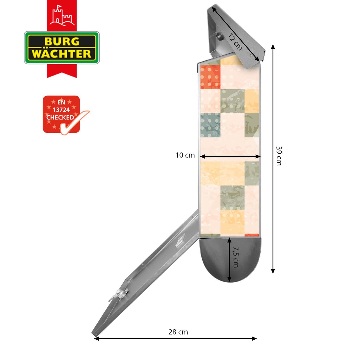 Der BURG-WÄCHTER Edelstahl Briefkasten mit Motiv Mosaik Rot und Zeitungsrolle bietet Ihnen mit seinem Fassungsvermögen genügend Platz auch für große A4 Sendungen und Zeitschriften. Das integrierte Regendach schützt Ihre Post vor dem Eindringen von Regen.