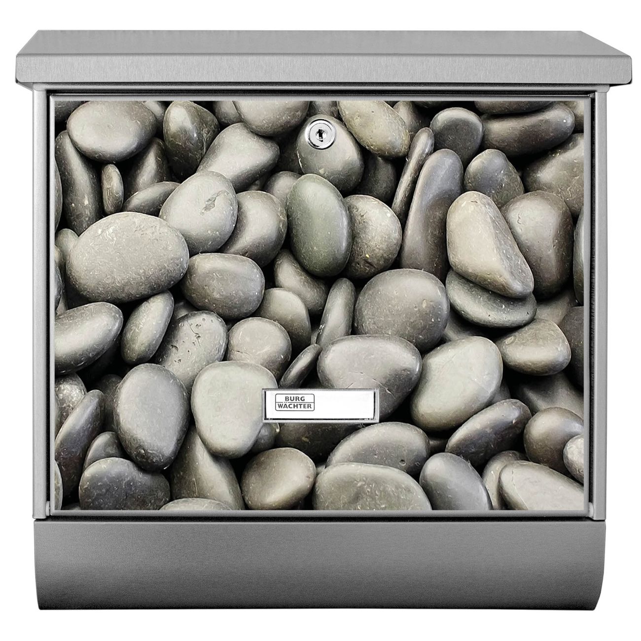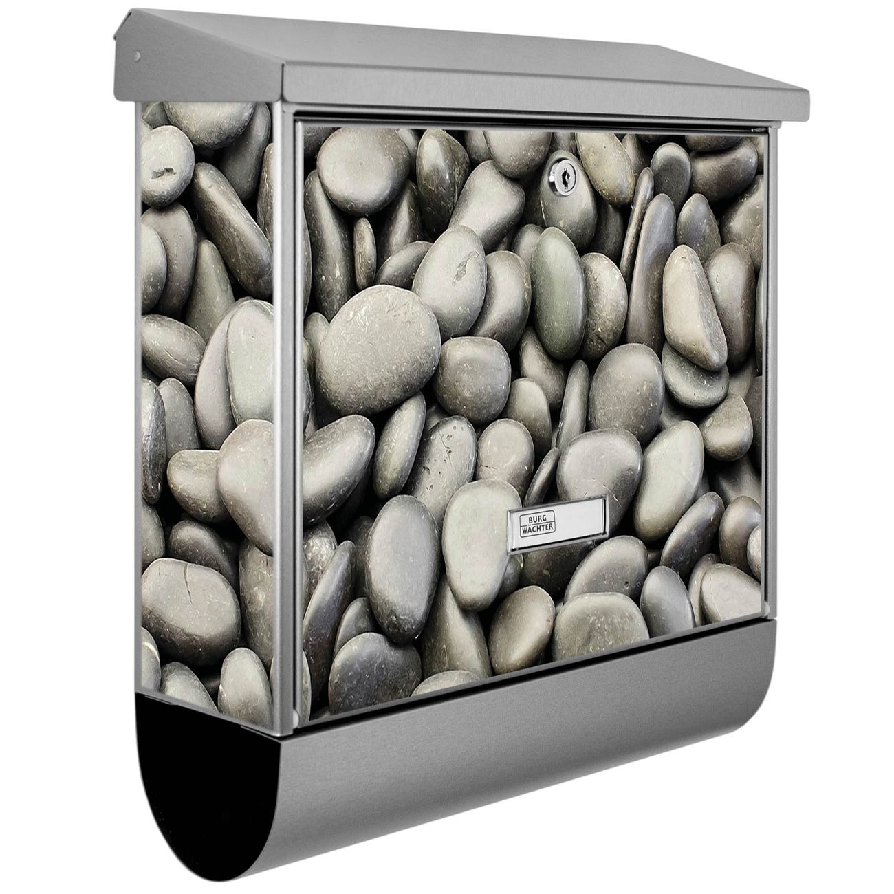 Der BURG-WÄCHTER Edelstahl Briefkasten mit Motiv Nasse Kiesel und Zeitungsrolle bietet Ihnen mit seinem Fassungsvermögen genügend Platz auch für große A4 Sendungen und Zeitschriften. Das integrierte Regendach schützt Ihre Post vor dem Eindringen von Regen.