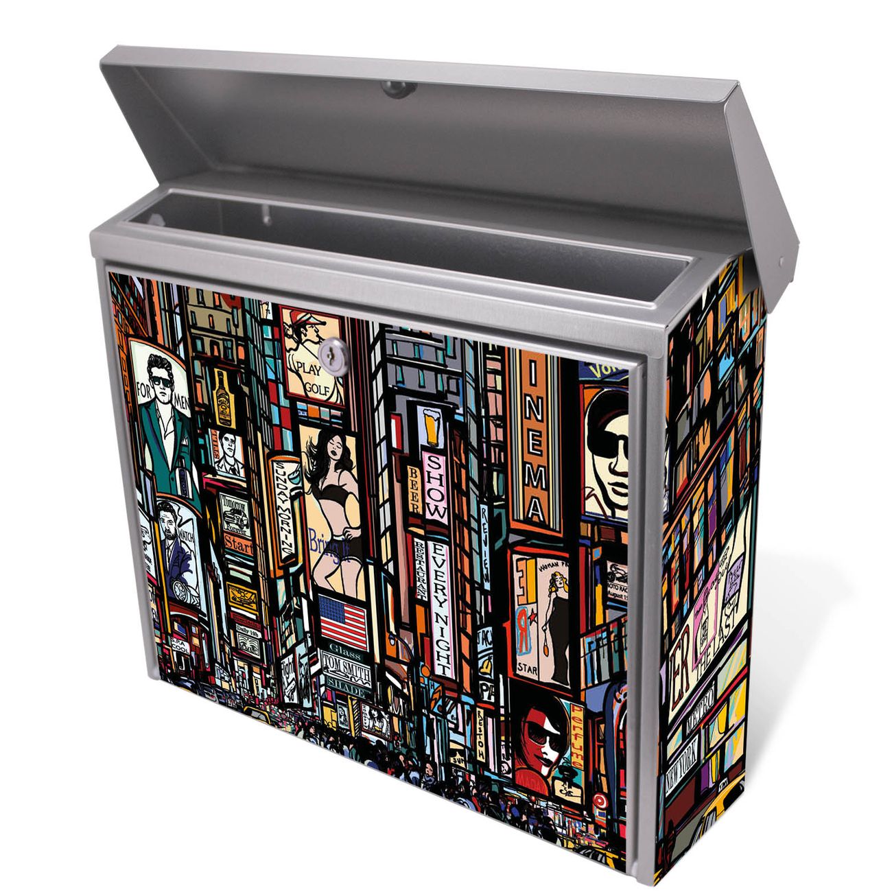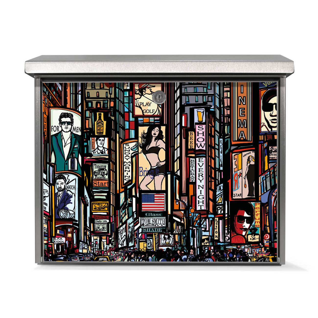 Der Postkasten mit New York Show Motiv hat ein sehr ansprechendes und zeitloses Design. Unsere Motivpalette hält jede Menge Varianten bereit, ob klassisch, modern, verspielt oder witzig - für jeden haben wir das passende Motiv parat. Der Briefkasten ist das Aushängeschild Ihres Hauses.