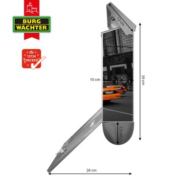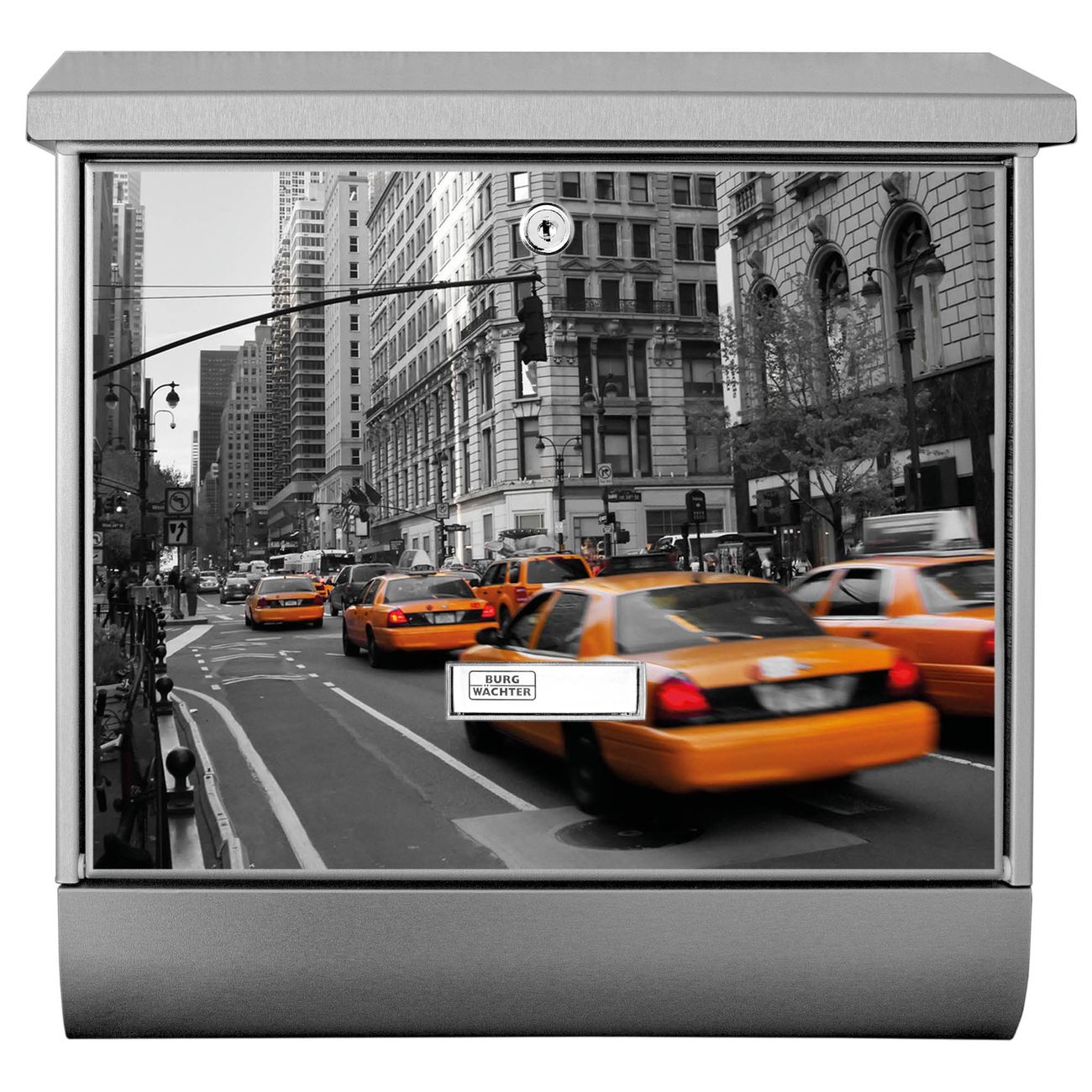 Der BURG-WÄCHTER Edelstahl Briefkasten mit Motiv New York Taxi und Zeitungsrolle bietet Ihnen mit seinem Fassungsvermögen genügend Platz auch für große A4 Sendungen und Zeitschriften. Das integrierte Regendach schützt Ihre Post vor dem Eindringen von Regen.