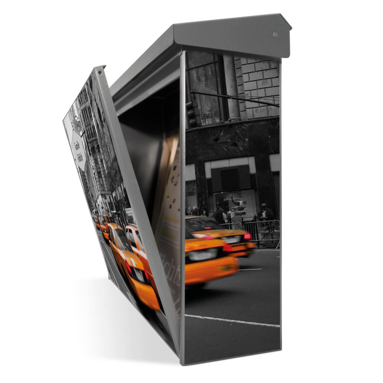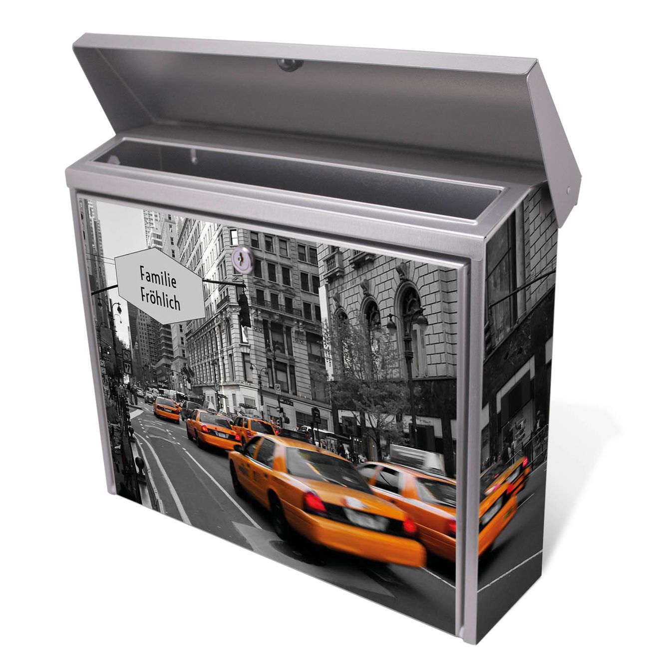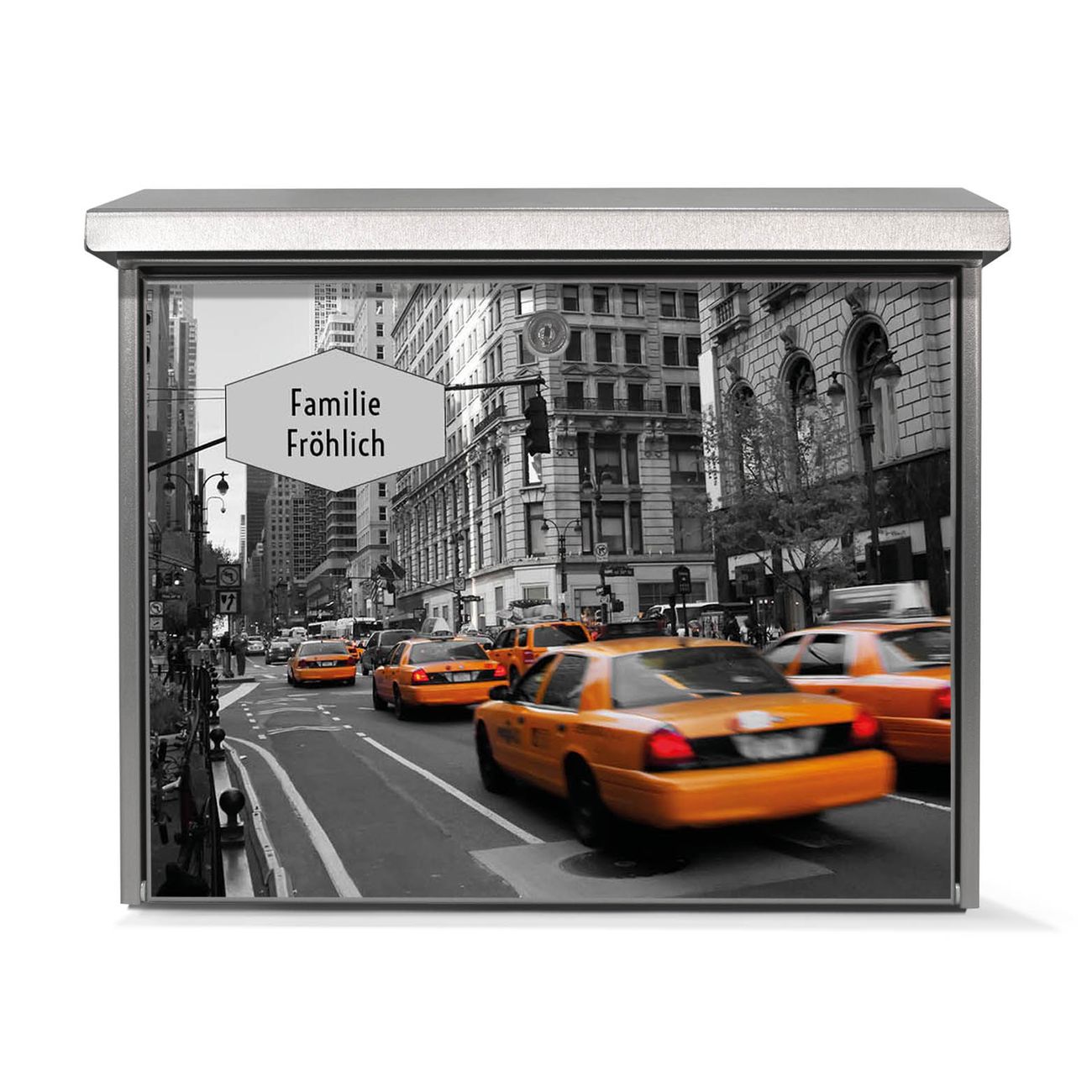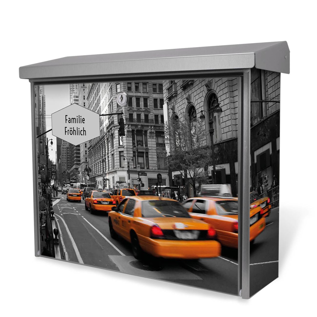 Der Postkasten mit New York Taxi Motiv hat ein sehr ansprechendes und zeitloses Design. Unsere Motivpalette hält jede Menge Varianten bereit, ob klassisch, modern, verspielt oder witzig - für jeden haben wir das passende Motiv parat. Der Briefkasten ist das Aushängeschild Ihres Hauses.
