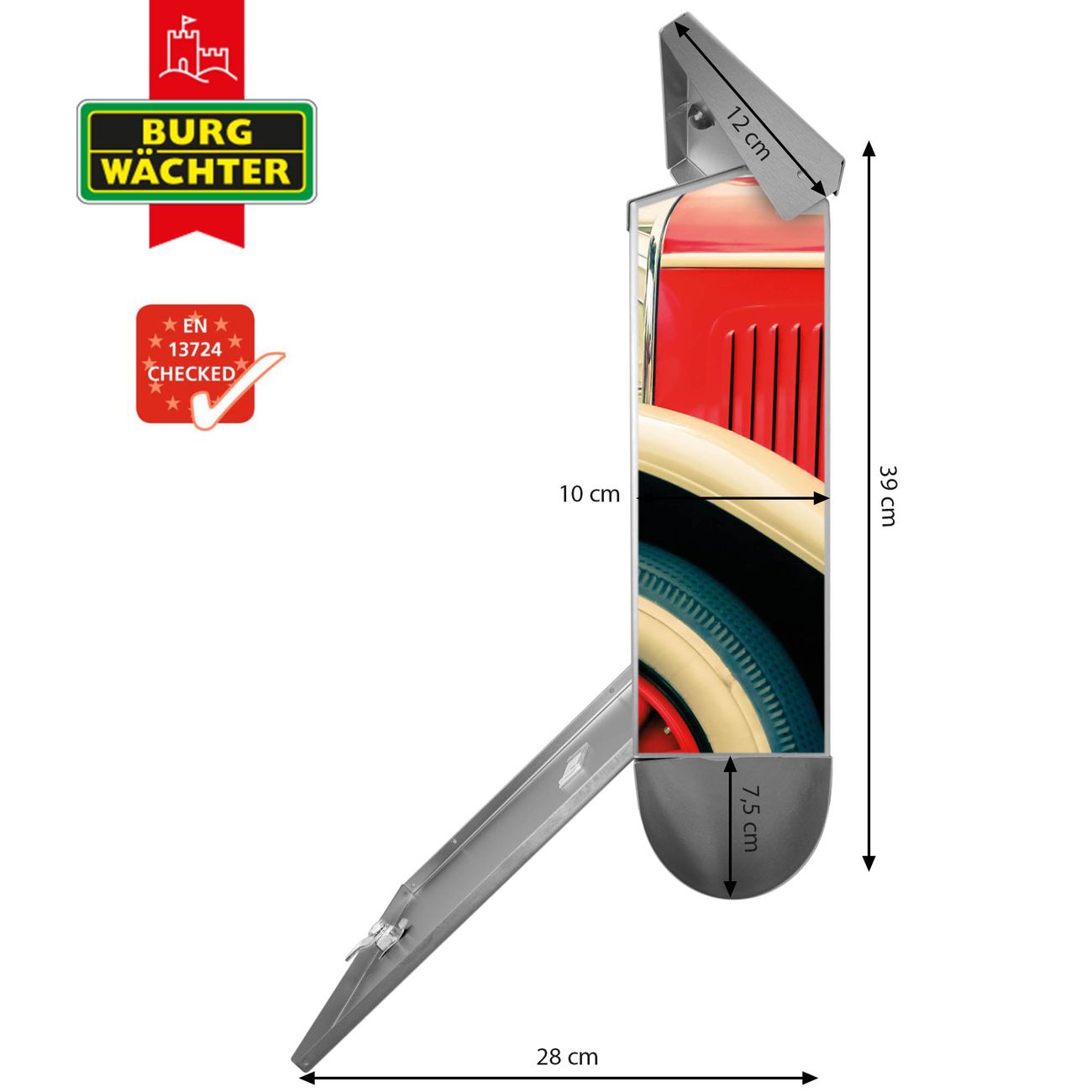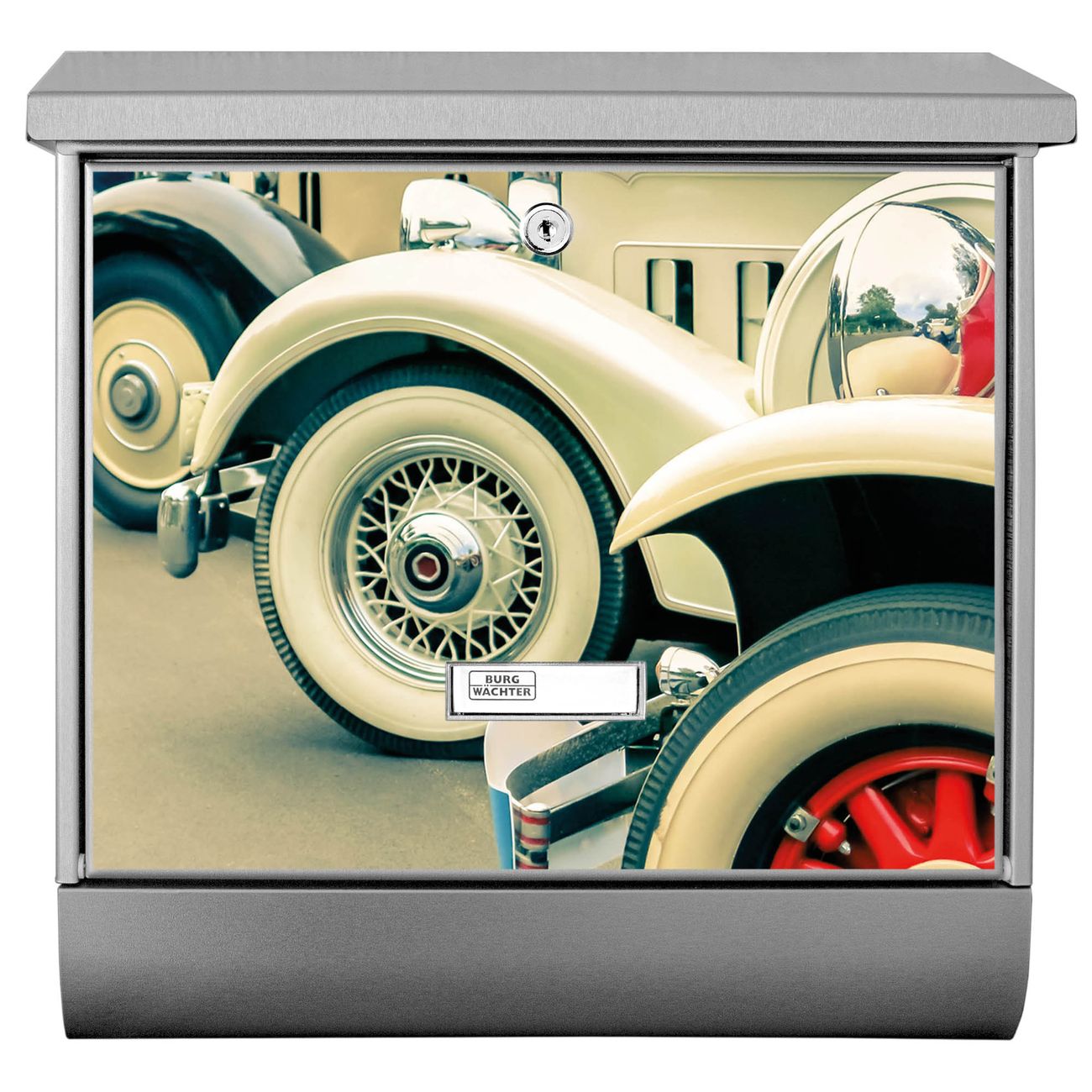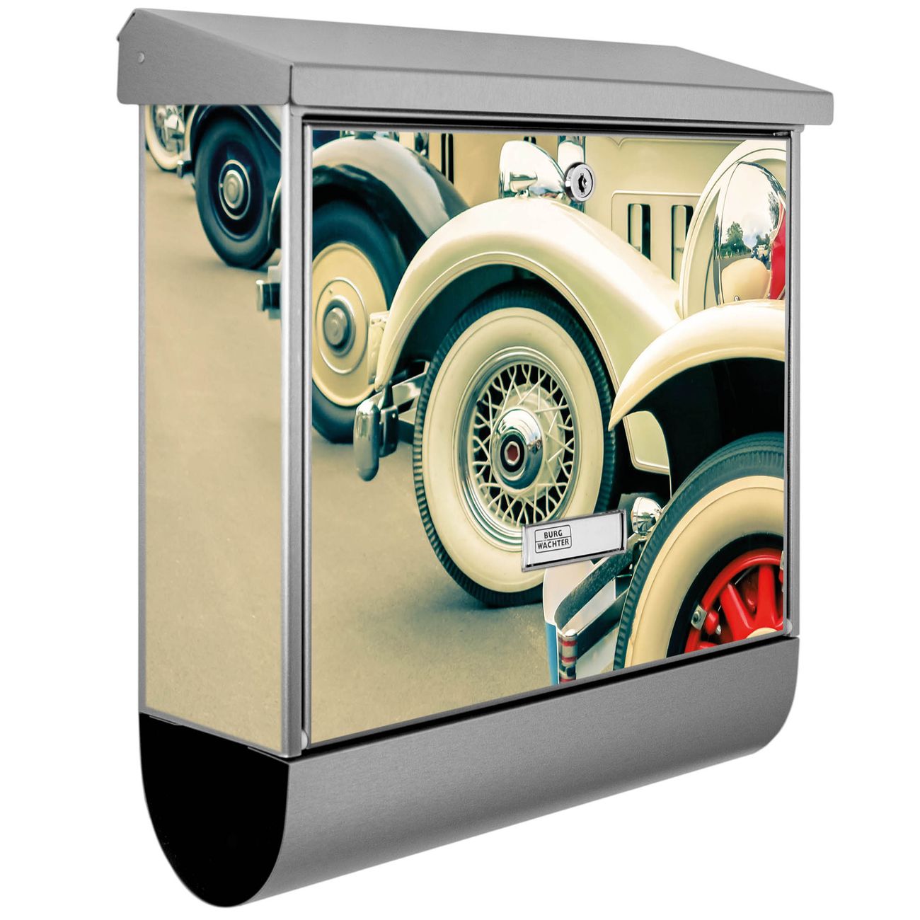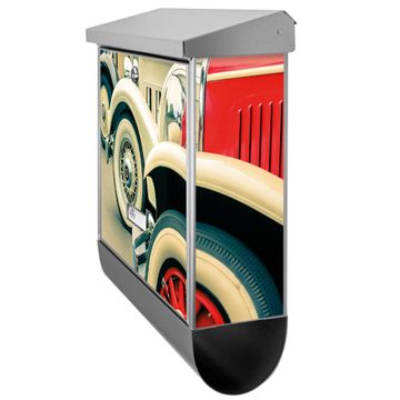Der BURG-WÄCHTER Edelstahl Briefkasten mit Motiv Oldtimer Räder und Zeitungsrolle bietet Ihnen mit seinem Fassungsvermögen genügend Platz auch für große A4 Sendungen und Zeitschriften. Das integrierte Regendach schützt Ihre Post vor dem Eindringen von Regen.